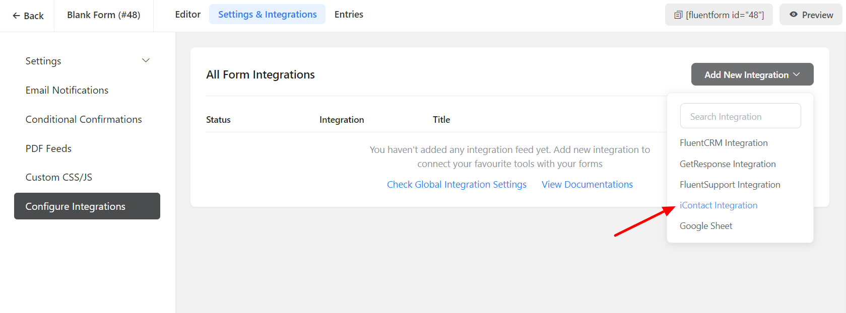 - Now go to the particular form’s settings for the entries you want to be listed in iContact. Click on Add New Integration and select iContact Integration from the dropdown.