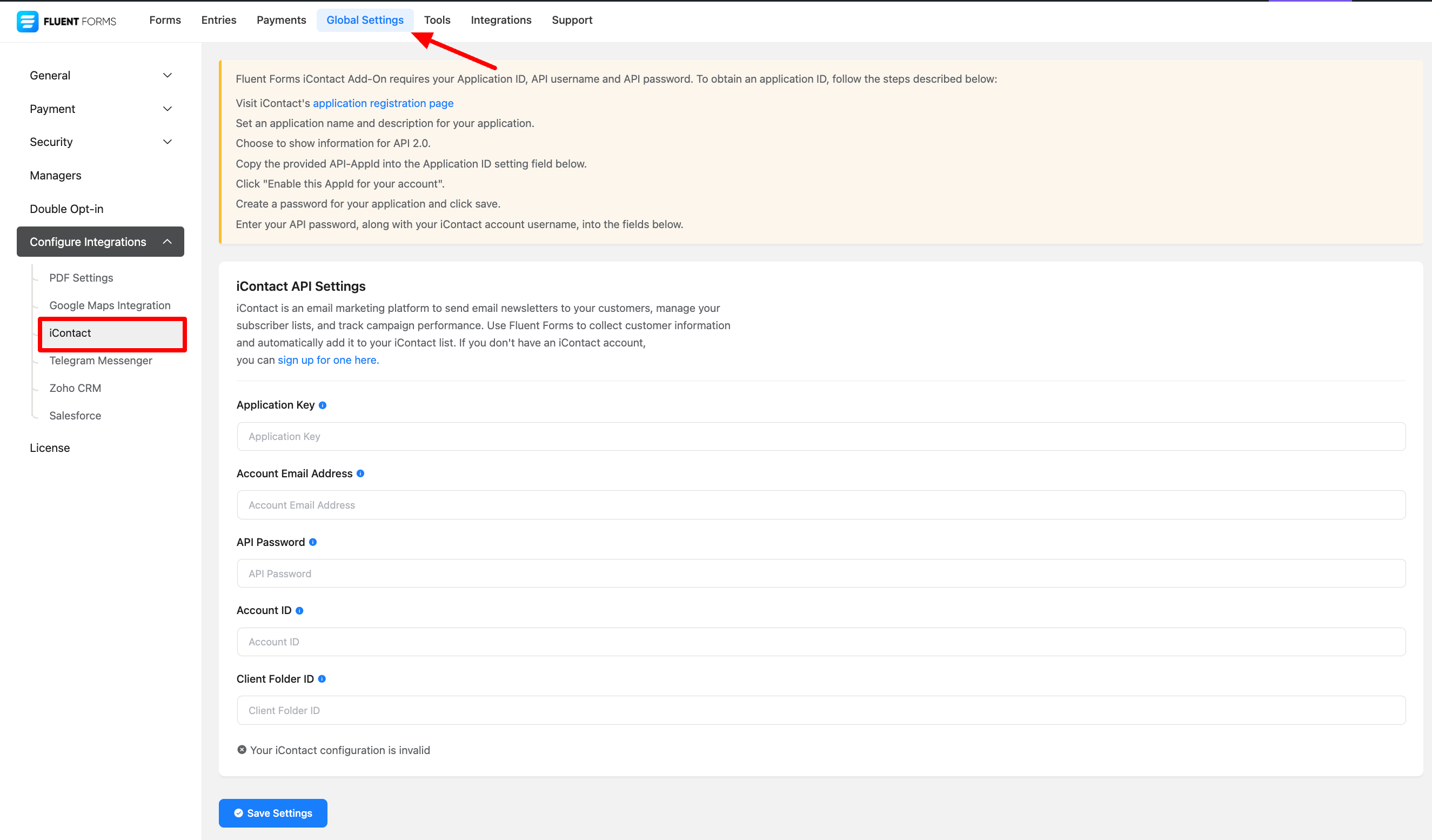 - Again hover over Fluent Forms Pro and go to Settings. Select iContact, and you will be asked for the iContact Application Key, Account Email Address, API Password, and Client Folder ID.