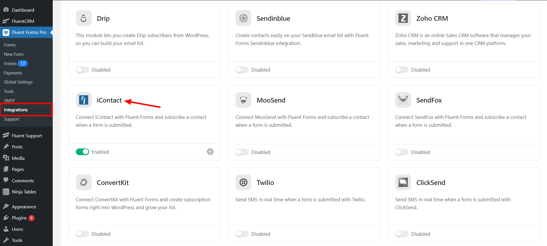 - Go to the Integration Modules from Fluent Forms (WordPress admin panel sidebar) and turn on the iContact Module, as shown in the screenshot below-
