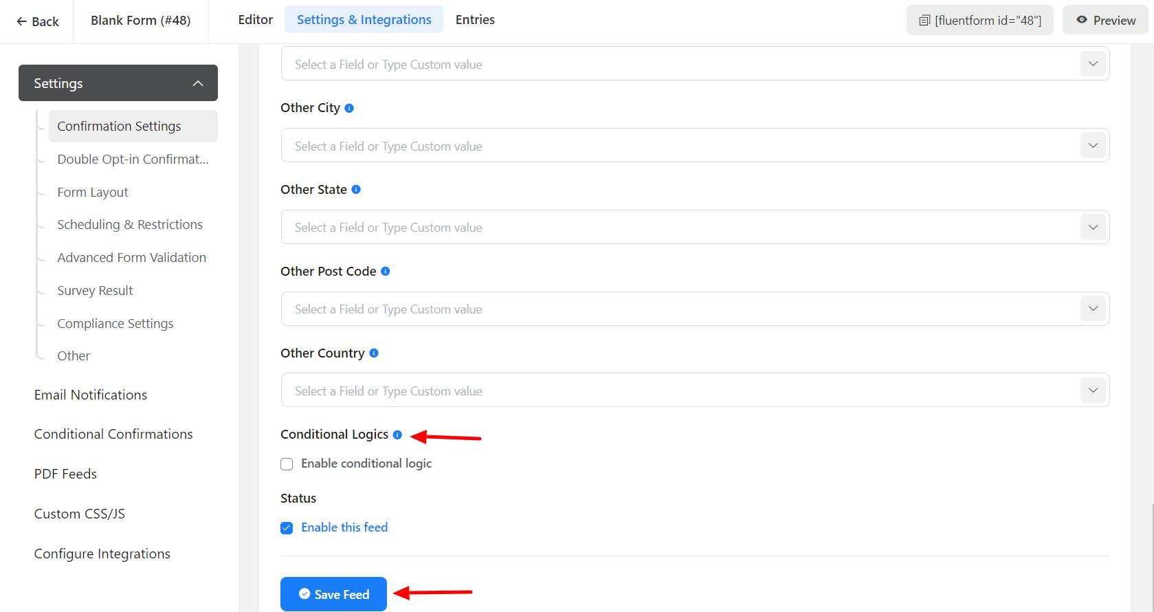 • Enable Conditional Logic if required. Learn more about Fluent Forms Conditional logic here.