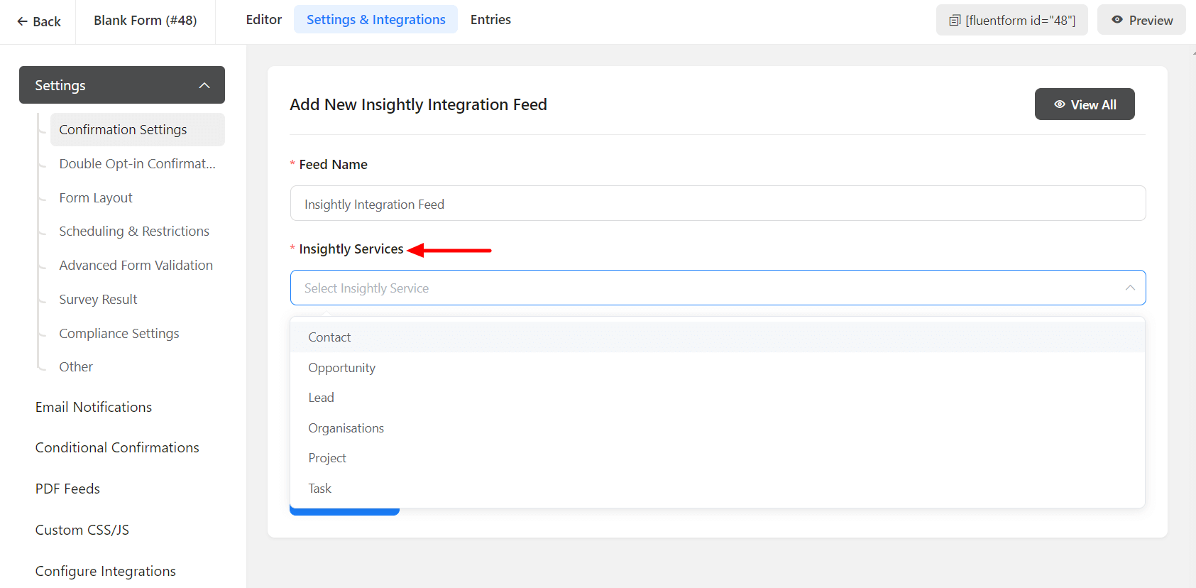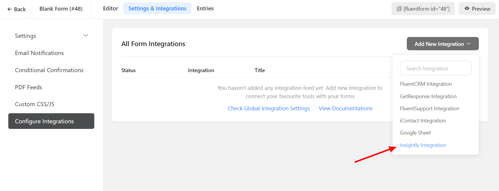• Now, go to the particular form’s settings for the entries you want to be listed in Insightly. Click on Add New Integration and select Insightly Integration from the dropdown.