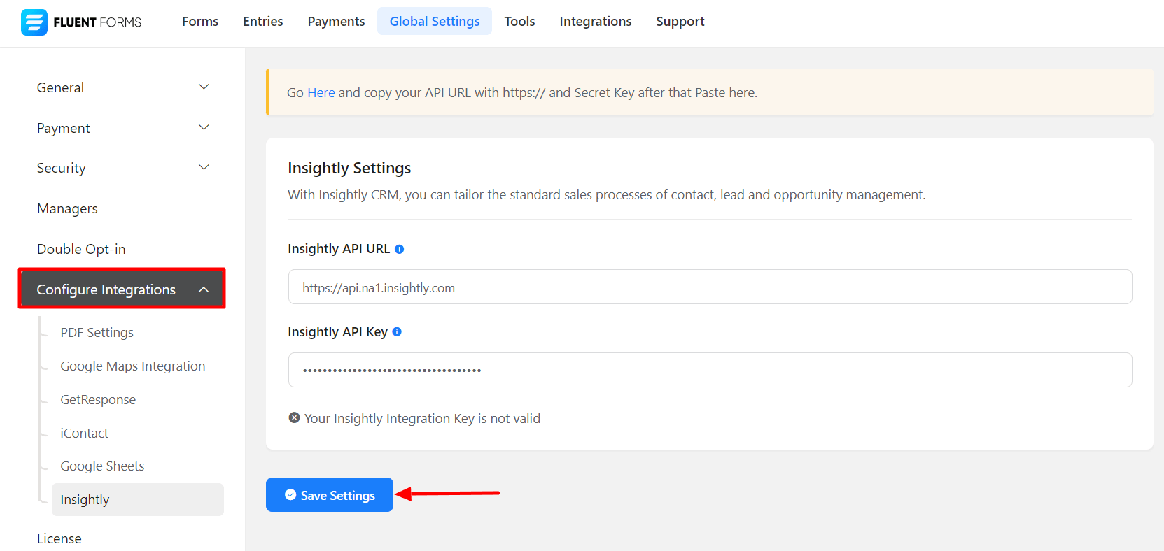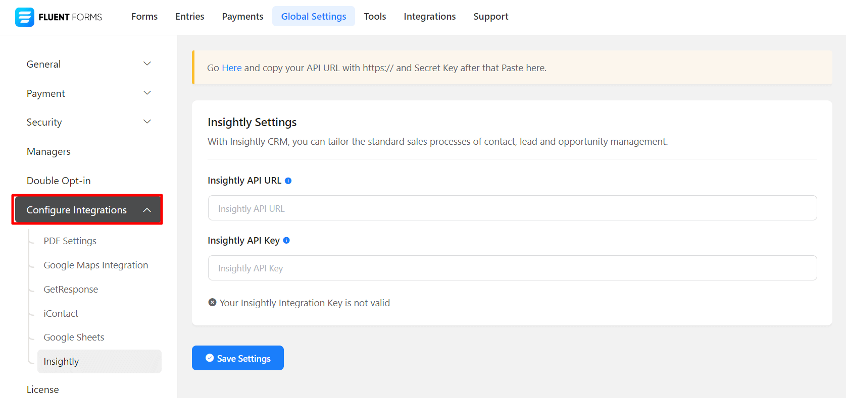 • Again hover over Fluent Forms Pro and go to Settings. Select Insightly, and you will be asked for the Insightly API URL & Insightly API Key here.
