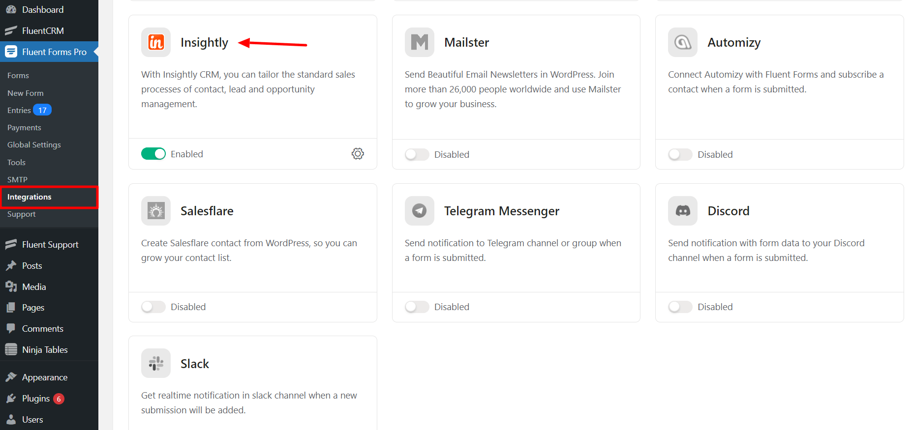 • Go to the Integration Modules from Fluent Forms (WordPress admin panel sidebar) and turn on the Insightly Module, as shown in the screenshot below –
