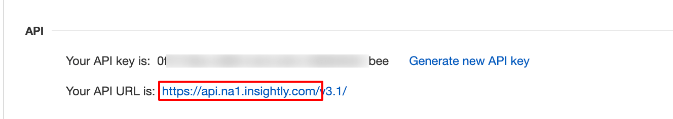 • Copy the API Key & API URL ( https://api.na1.insightly.com/ ) like this to use in the next step.