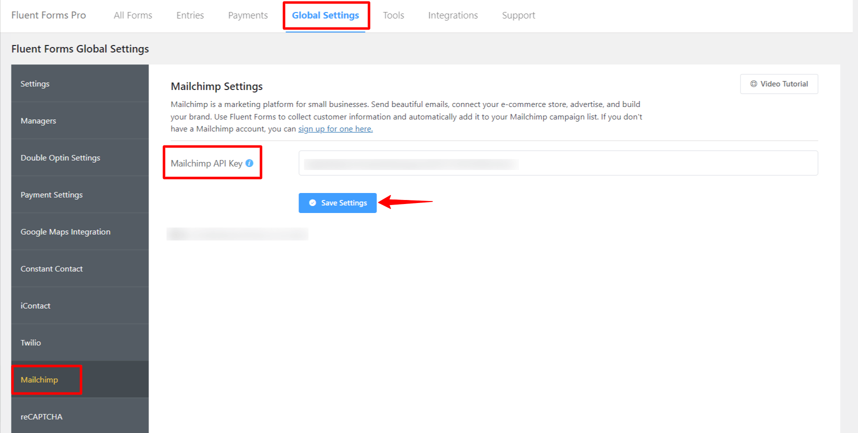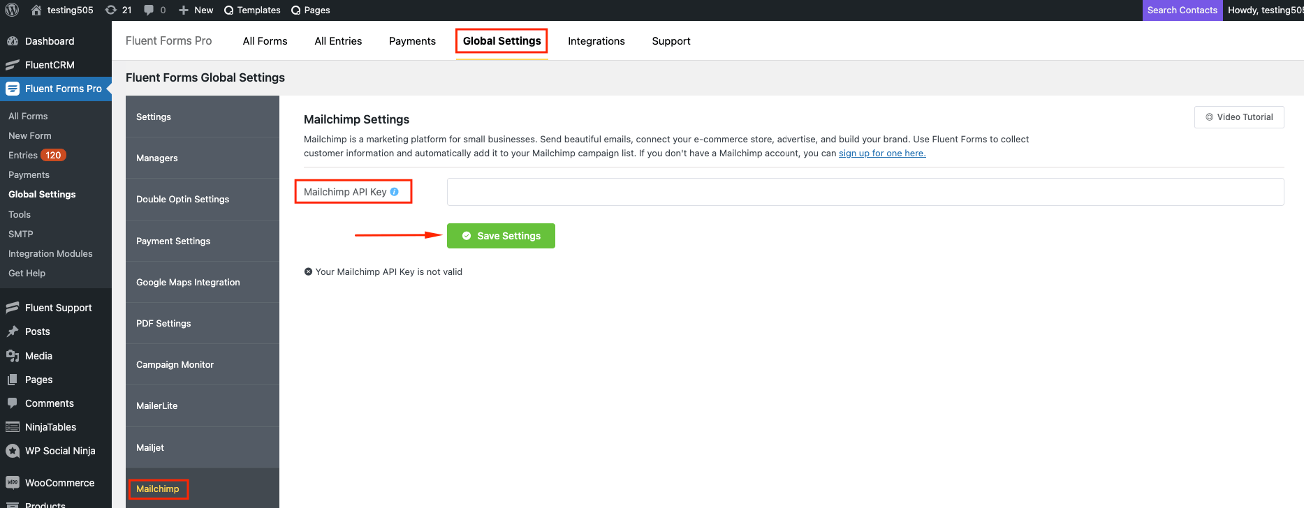 • Again hover over Fluent Forms Pro and go to Settings. Select Mailchimp, and you will be asked for the Mailchimp API Key here.