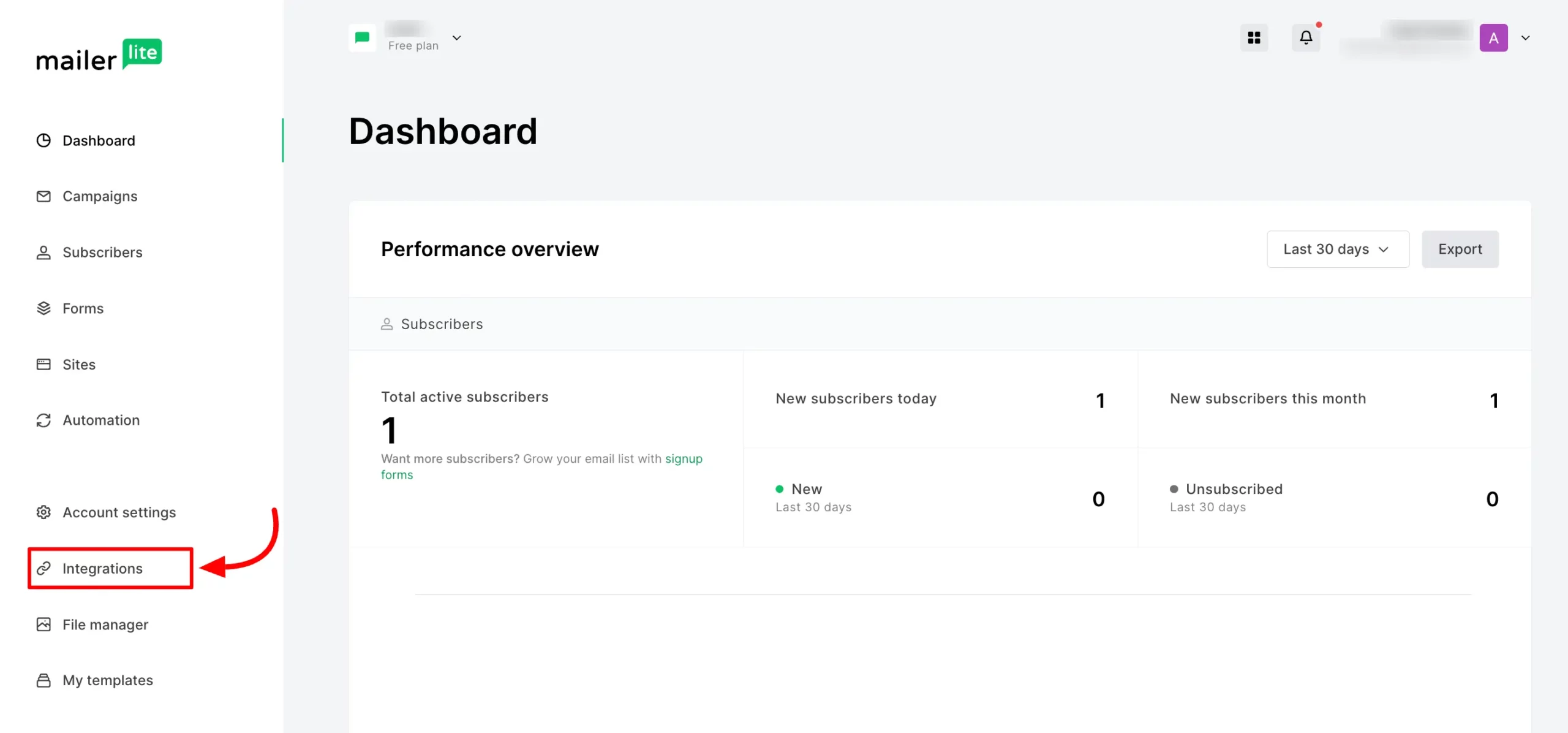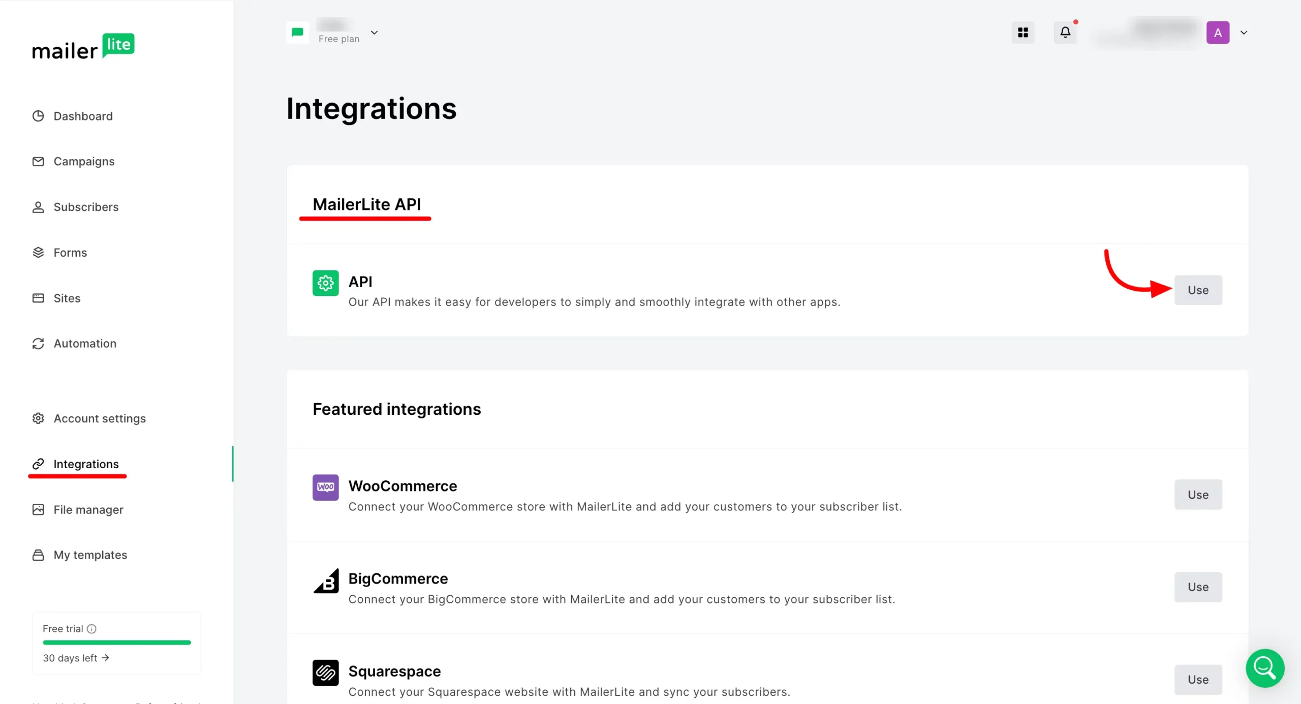 - To get the MailerLite API Key, sign in to your MailerLite dashboard, and choose Integrations from the left sidebar.