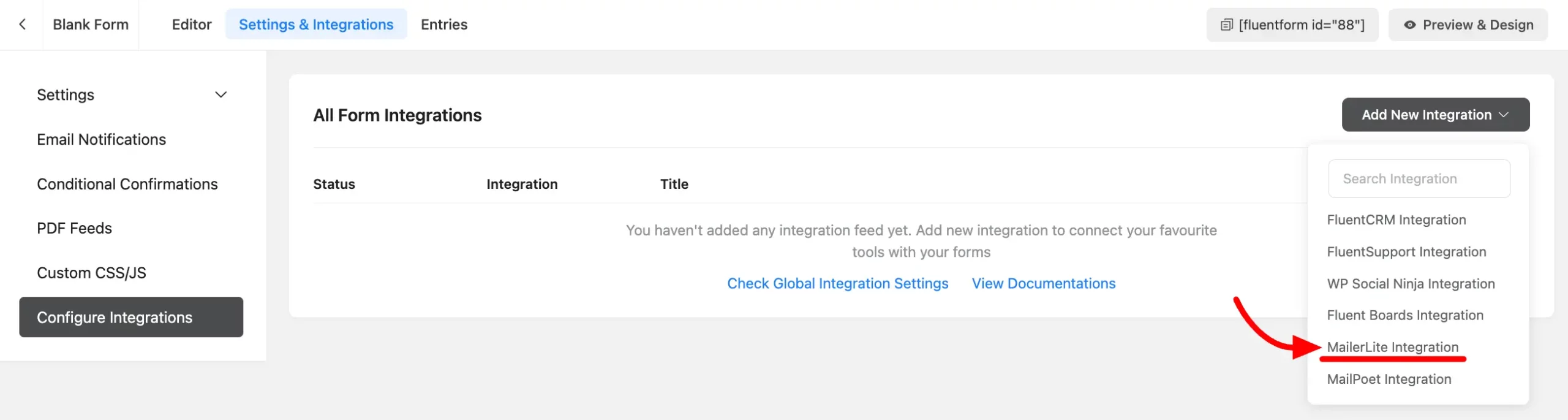 - Now click on Add New Integration and select MailerLite Integration from the dropdown.