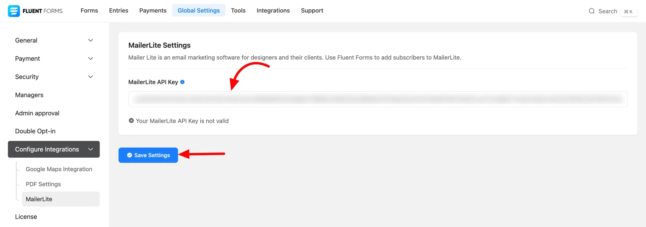 - Go to the Global Settings of Fluent Forms and select Configure Integration from the Left sidebar. Here you will find MailerLite click on it and paste the MailerLite API Key in the API Key field.