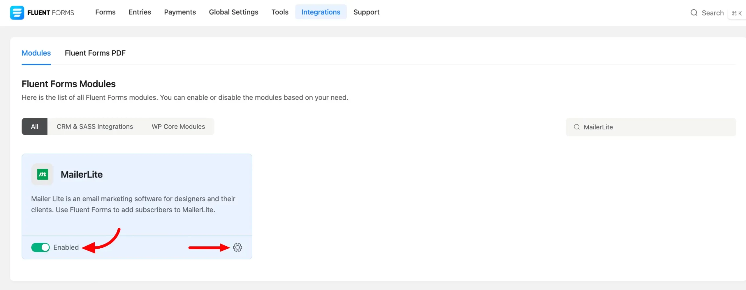 - Go to the Integrations from Fluent Forms and enable the MailerLite Module, as shown in the screenshot below. You can also go to the MailerLite settings from here by clicking on the Settings icon button.