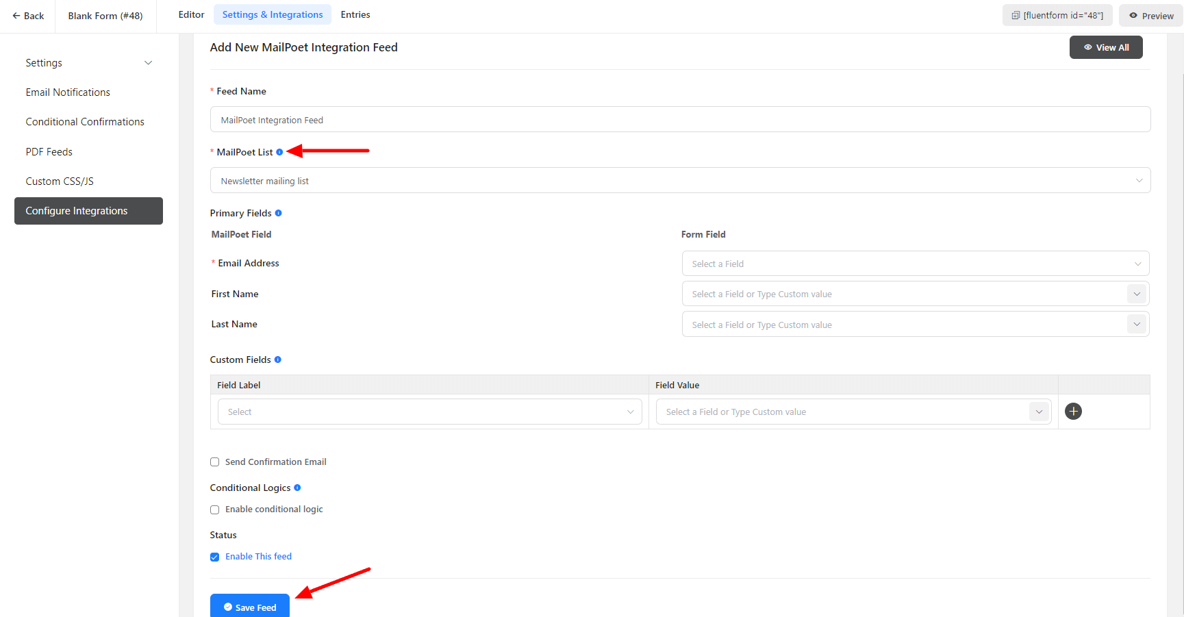 • Select which Fluent Forms fields pair with their respective MailPoet fields in the Custom Fields option.