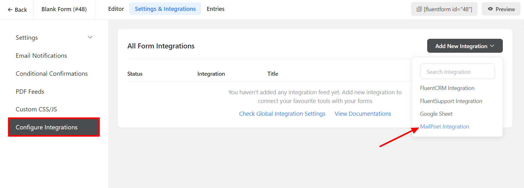 • Now go to the particular form’s settings for the entries you want to be listed in MailPoet. Click on Add New Integration and select MailPoet Integration from the dropdown.