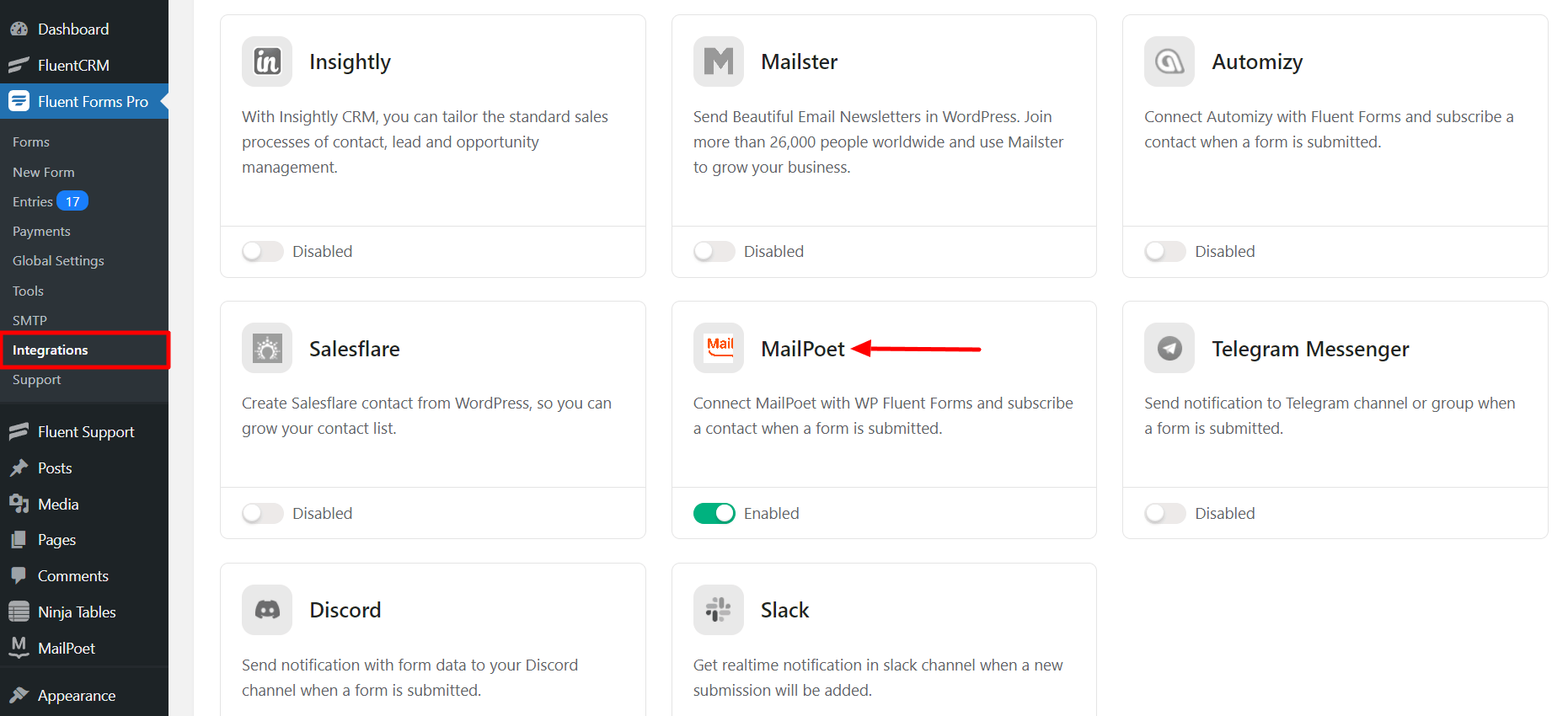 • Go to the Integration from Fluent Forms (WordPress admin panel sidebar) and turn on the MailPoet Module, as shown in the screenshot below-