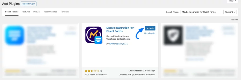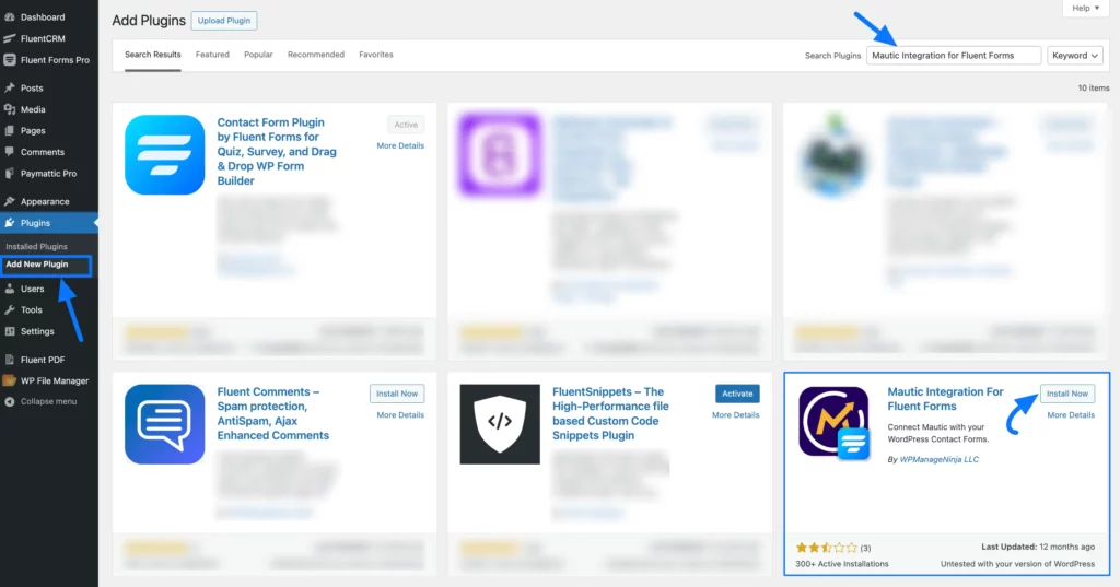First, go to Plugins from the WordPress Left Sidebar, click the Add New Plugin, search for Mautic Integration For Fluent Forms, and click the Install Now button.