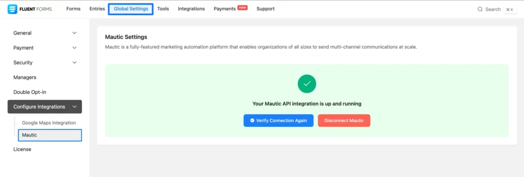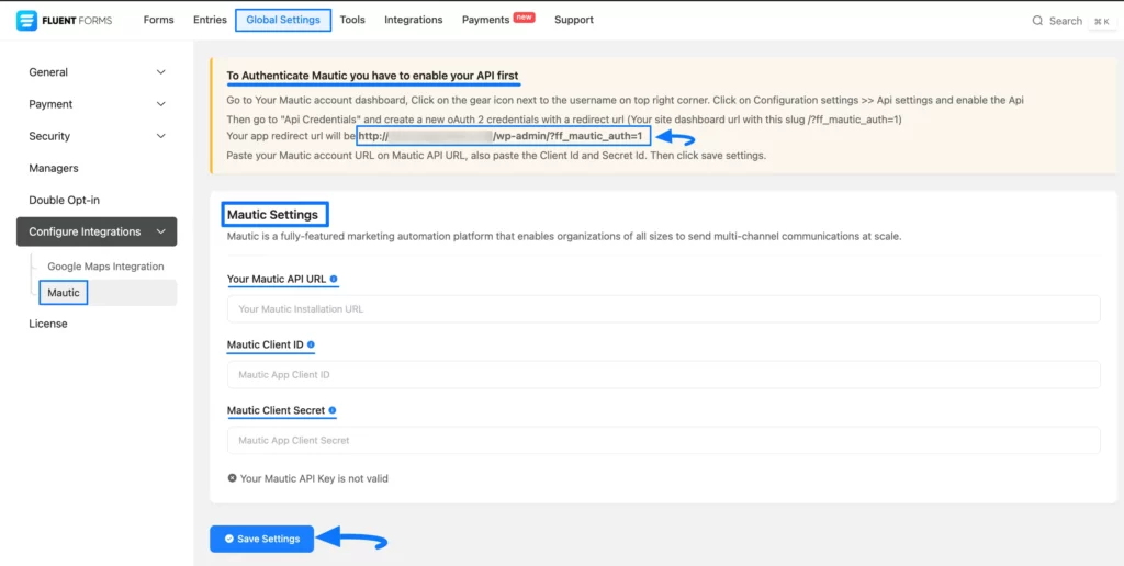 Once you get all the credentials, return to the Global Settings from the Fluent Forms Navbar, expand the Configure Integrations, and open the Mautic tab from the left sidebar.