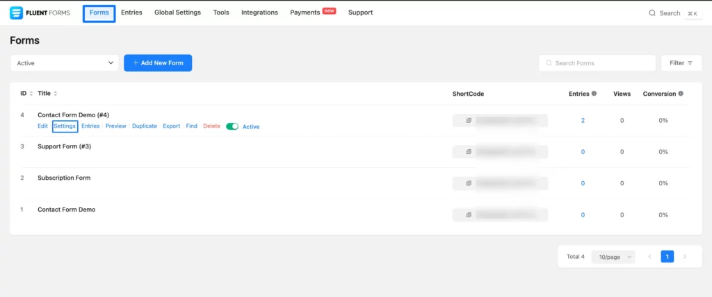 First, go to the Forms section from the Fluent Forms Navbar, and click the Settings button of your desired form where you want to add the feed.