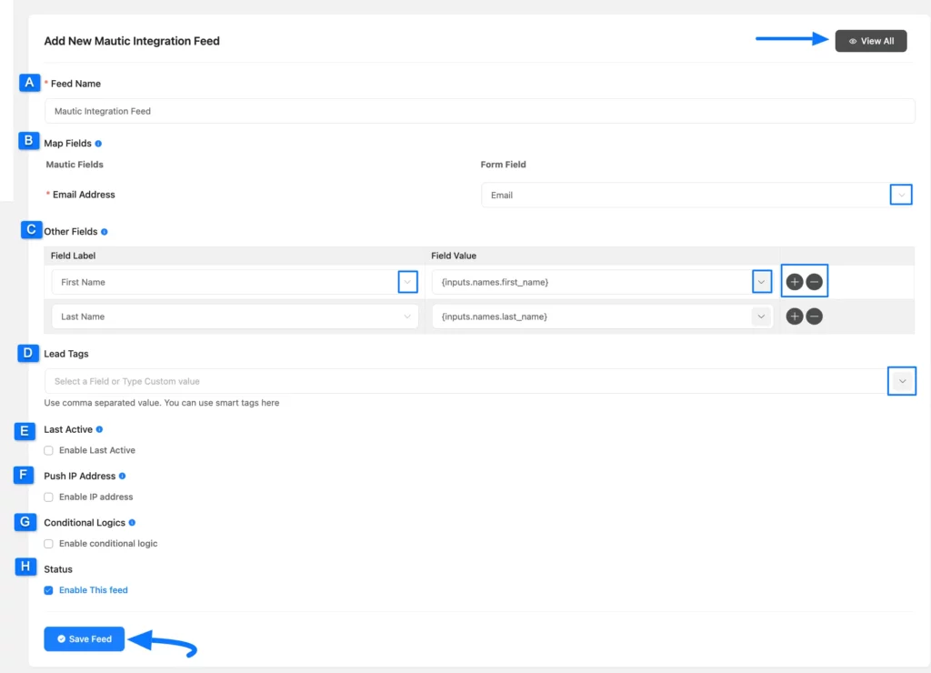 H. Status: Uncheck the Enable This Feed box if you want to save this Mautic Feed as Draft. Otherwise, enable this box to make this feed functional.