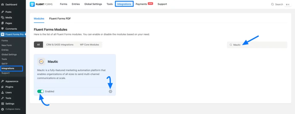 From your Fluent Forms Dashboard, go to Integrations, search for Mautic, and click the Toggle button to enable the Mautic Integration module in your FluentForms.