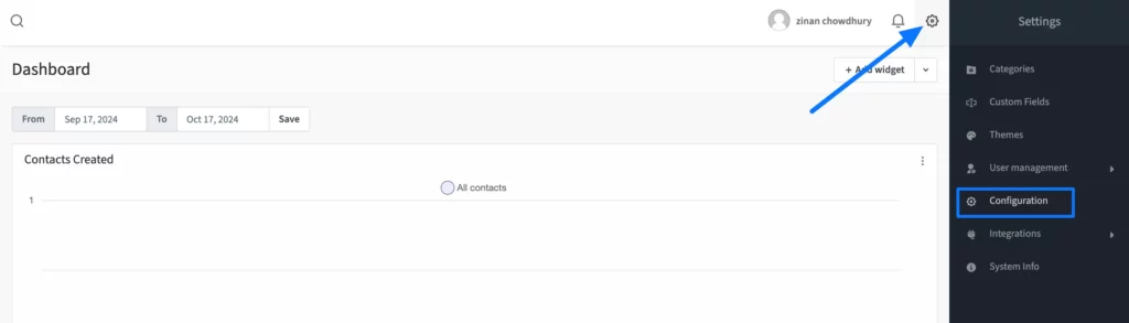 First, log in to your Mautic Account Dashboard, click the Settings Icon in the top right corner, and press the Configuration button from the left-side settings bar.