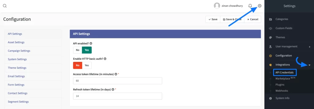 Again, go to the Settings Icon in the top right corner, expand the Integration dropdown, and click the API Credentials button in the left-side settings bar.