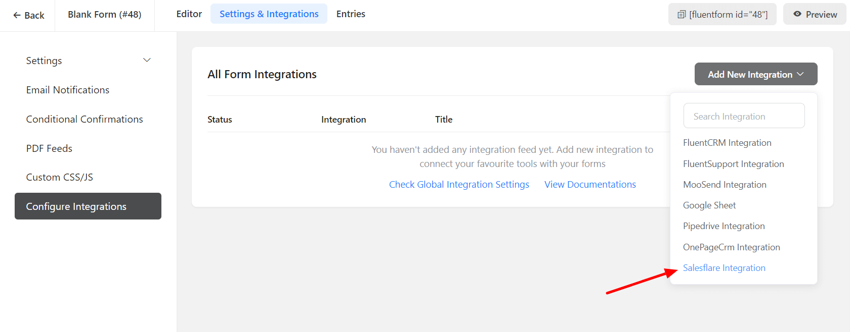- Now go to the particular form’s settings for the entries you want to be listed in Salesflare. Click on Add New Integration and select Salesflare Integration from the dropdown.