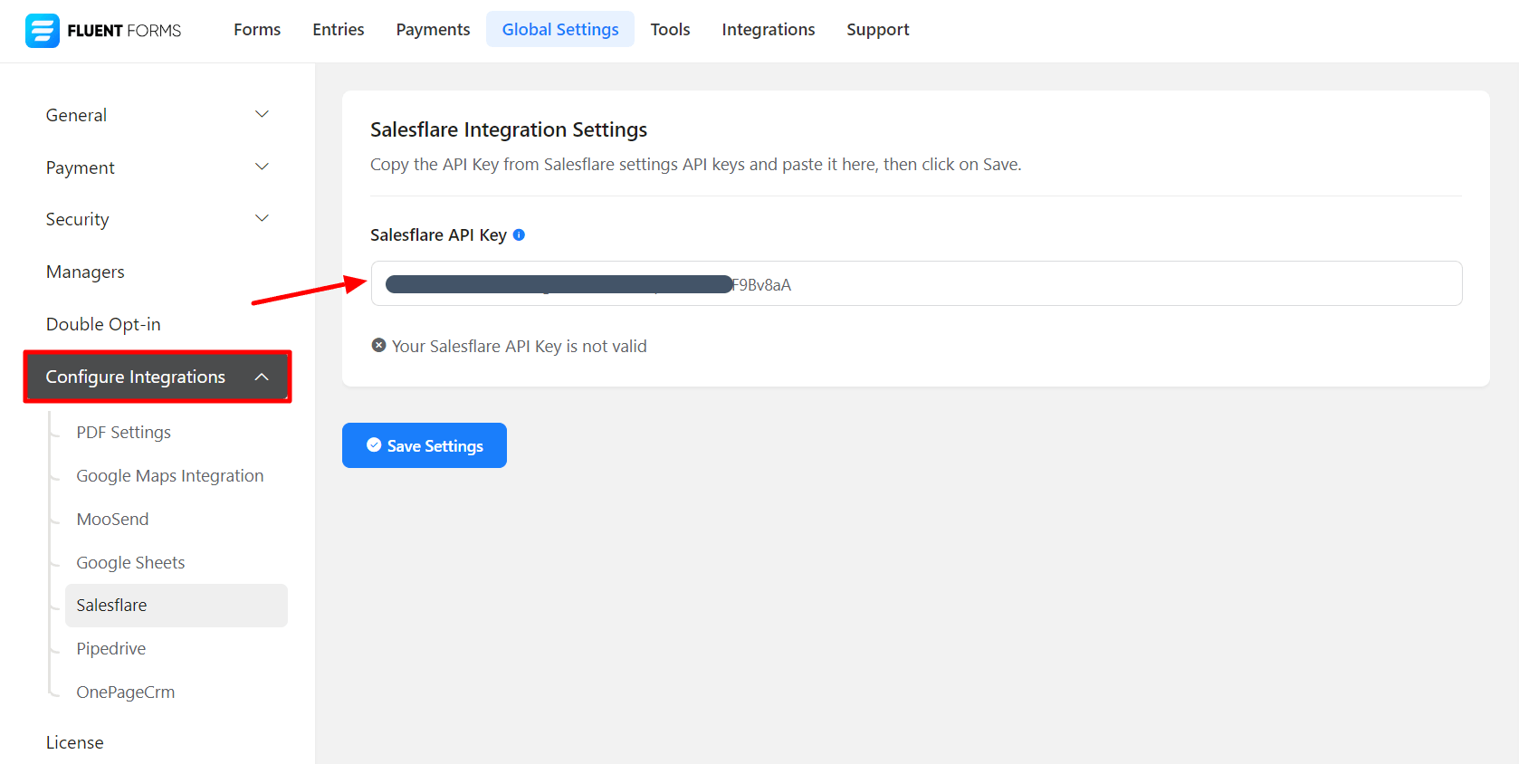 - Paste the API key to the API key field in the Fluent Forms Salesflare settings.