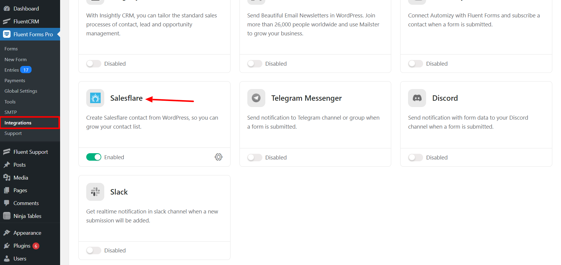- Go to the Integrations Modules from Fluent Forms (WordPress admin panel sidebar) and turn on the Salesflare Module, as shown in the screenshot below.