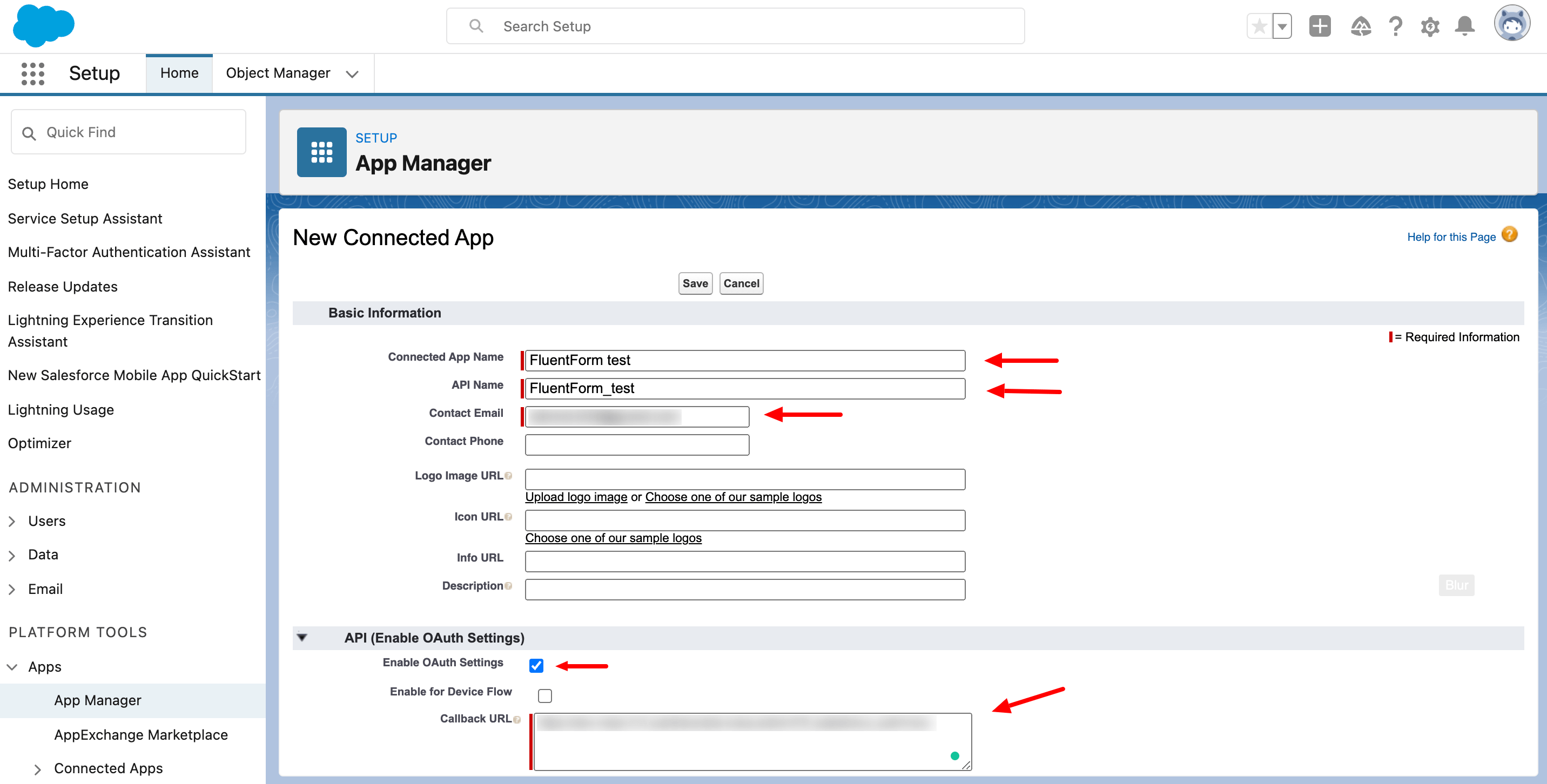 - Set the Connected App Name, API Name, and Contact Email.