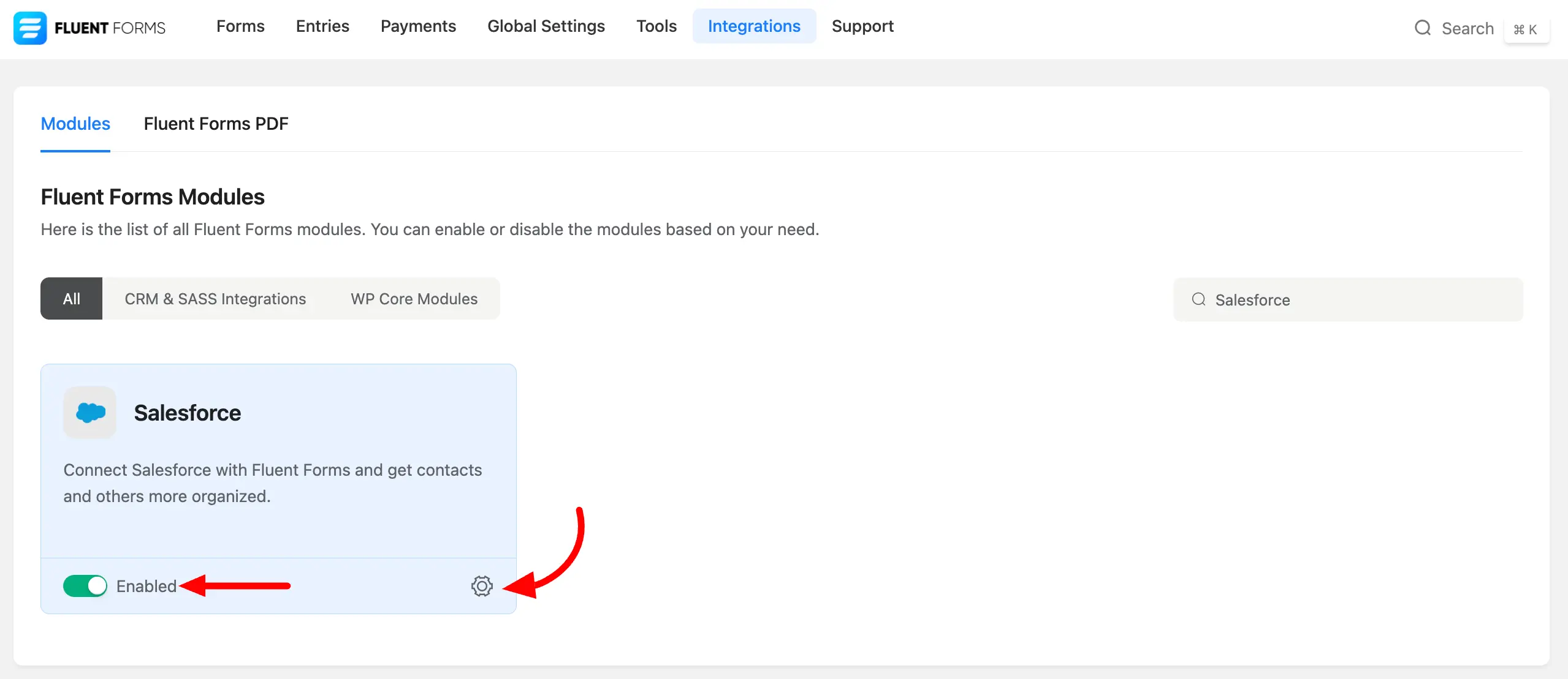 - Go to the Integration Modules from Fluent Forms (WordPress admin panel sidebar) and turn on the Salesforce Module, as shown in the screenshot below.