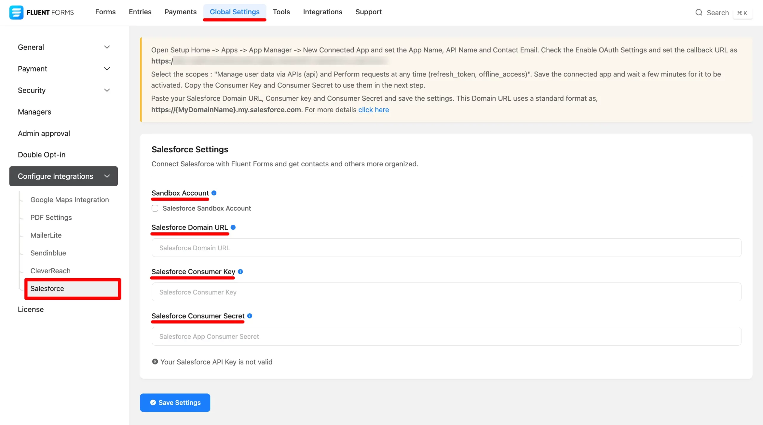 - Again hover over Fluent Forms Pro and go to Global Settings > Configure Integration. Select Salesforce, and you will be asked for the Salesforce Domain URL, Consumer Key & Consumer Secret here. If you are using Sandbox Account then check on the Salesforce Sandbox Account checkbox.