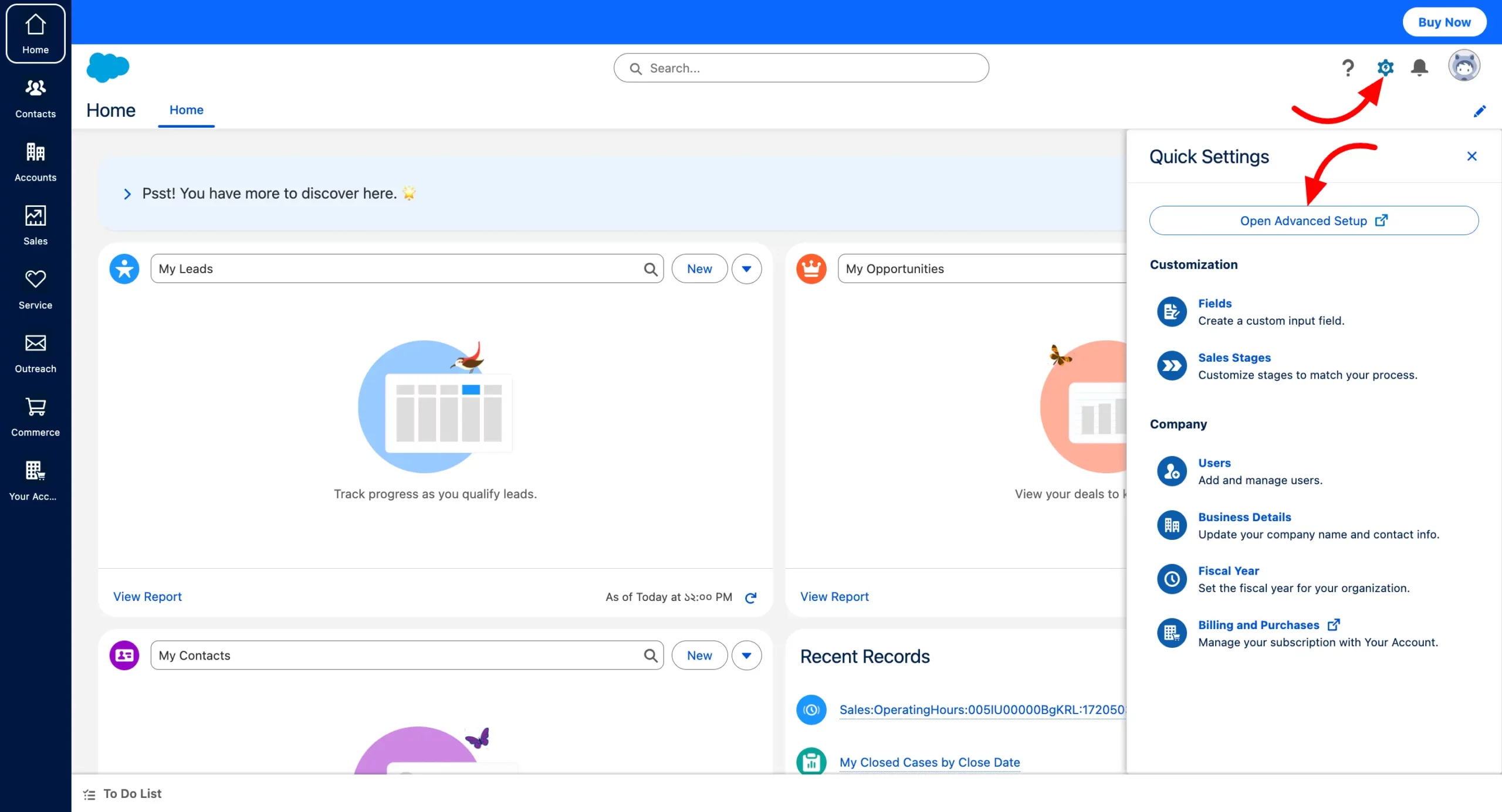 - After login into your account, a Setup Home page will appear. Click on the Settings icon button and then select the Open Advanced Setup.