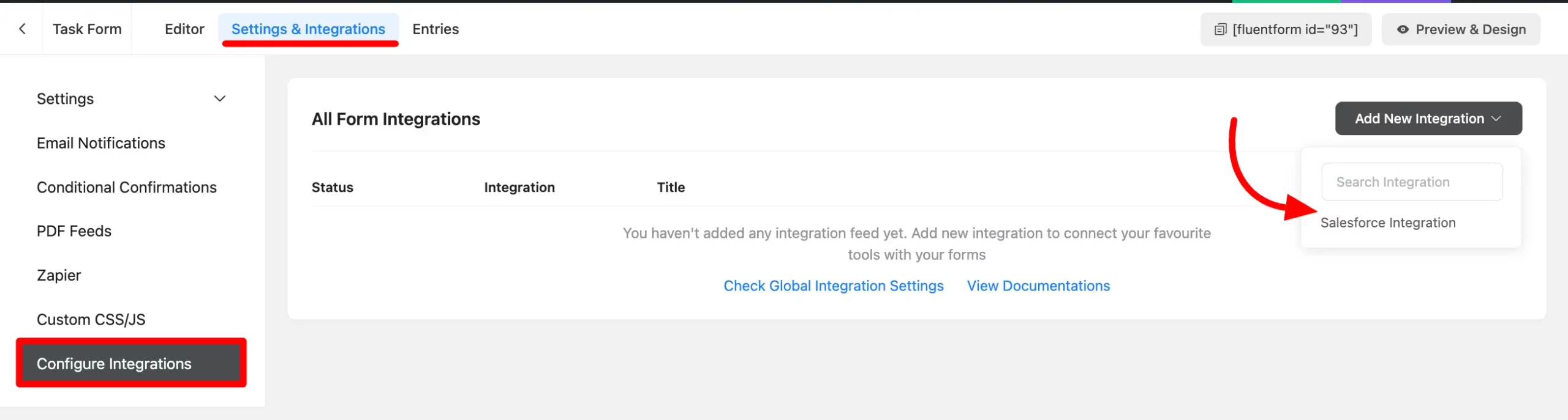 - Now go to the particular form’s settings for the entries you want to be listed in Salesforce. Go to Settings and Integration > Configure Integration then click on Add New Integration and select Salesforce Integration from the dropdown.