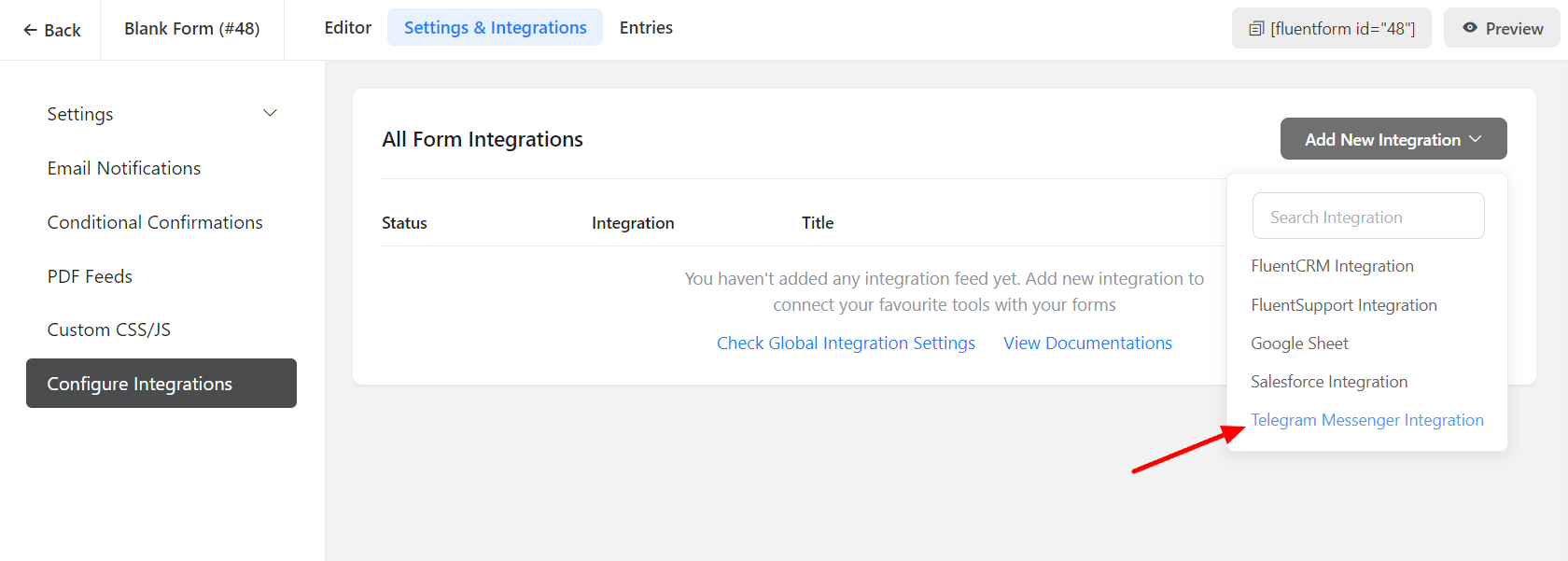 - Now, go to the settings of the particular form for the entries you want to be listed in Telegram. Click on Add New Integration and select Telegram Messenger Integration from the dropdown.