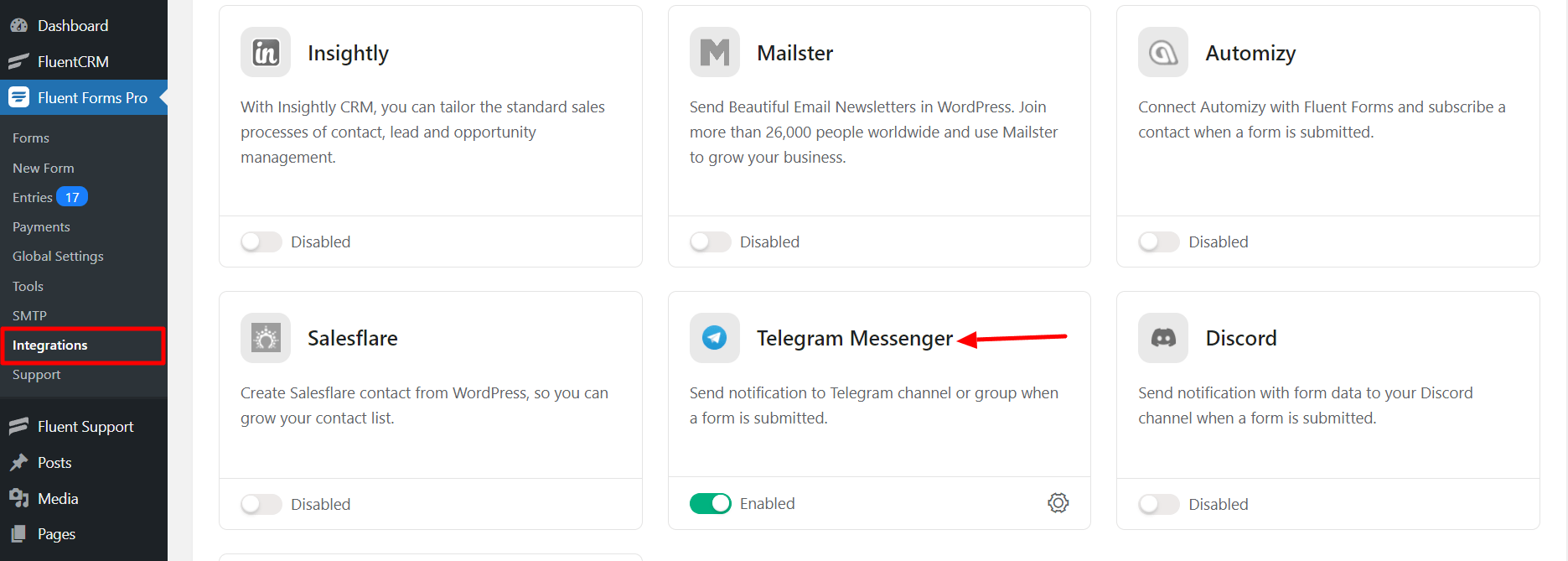 - Go to the Integration Modules from Fluent Forms (WordPress admin panel sidebar) and turn on the Telegram Messenger Module, as shown in the screenshot below-