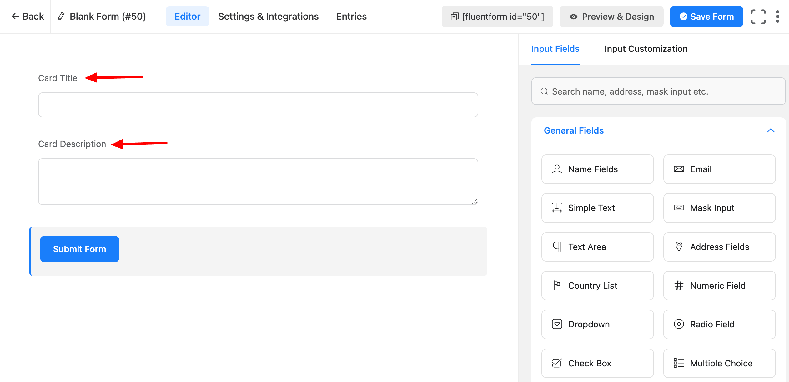 • Now, let’s create a form with Fluent Forms. Where a Simple Text field is used as a Card Title & Text Area field as Card Description. Take a look at the screenshot below-