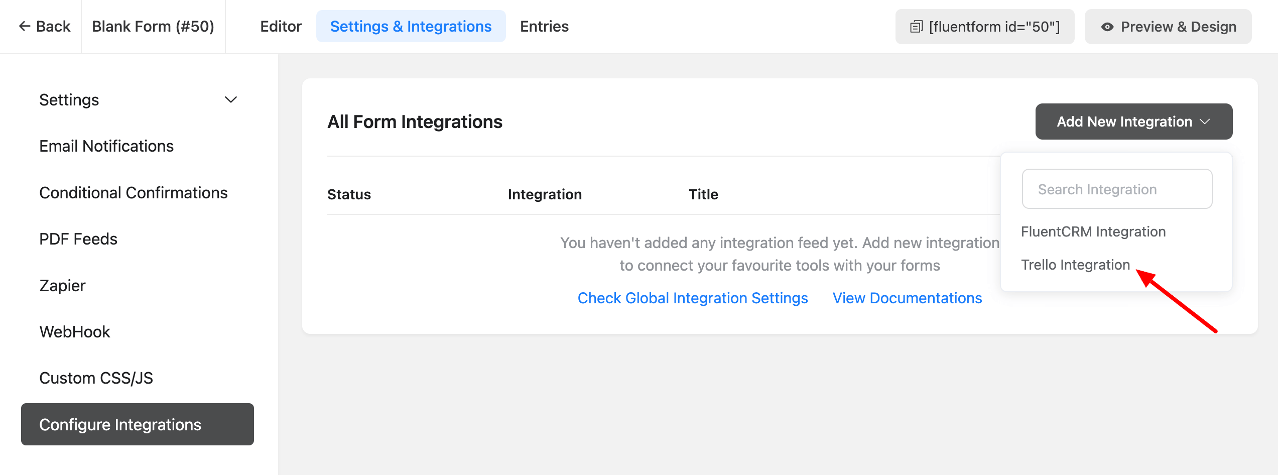 • Now, go to the settings of the particular form of the entries which you want to be listed in Trello. Click on Add New Integration and select Trello Integration from the dropdown.