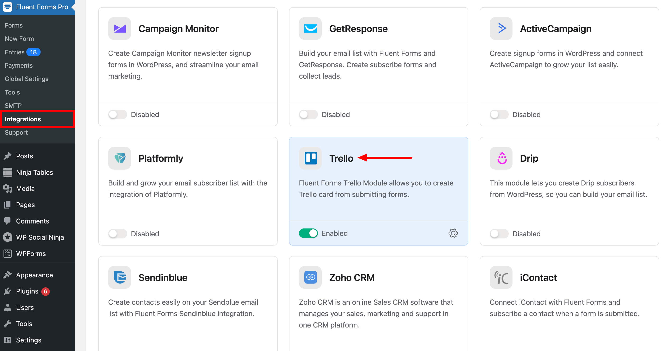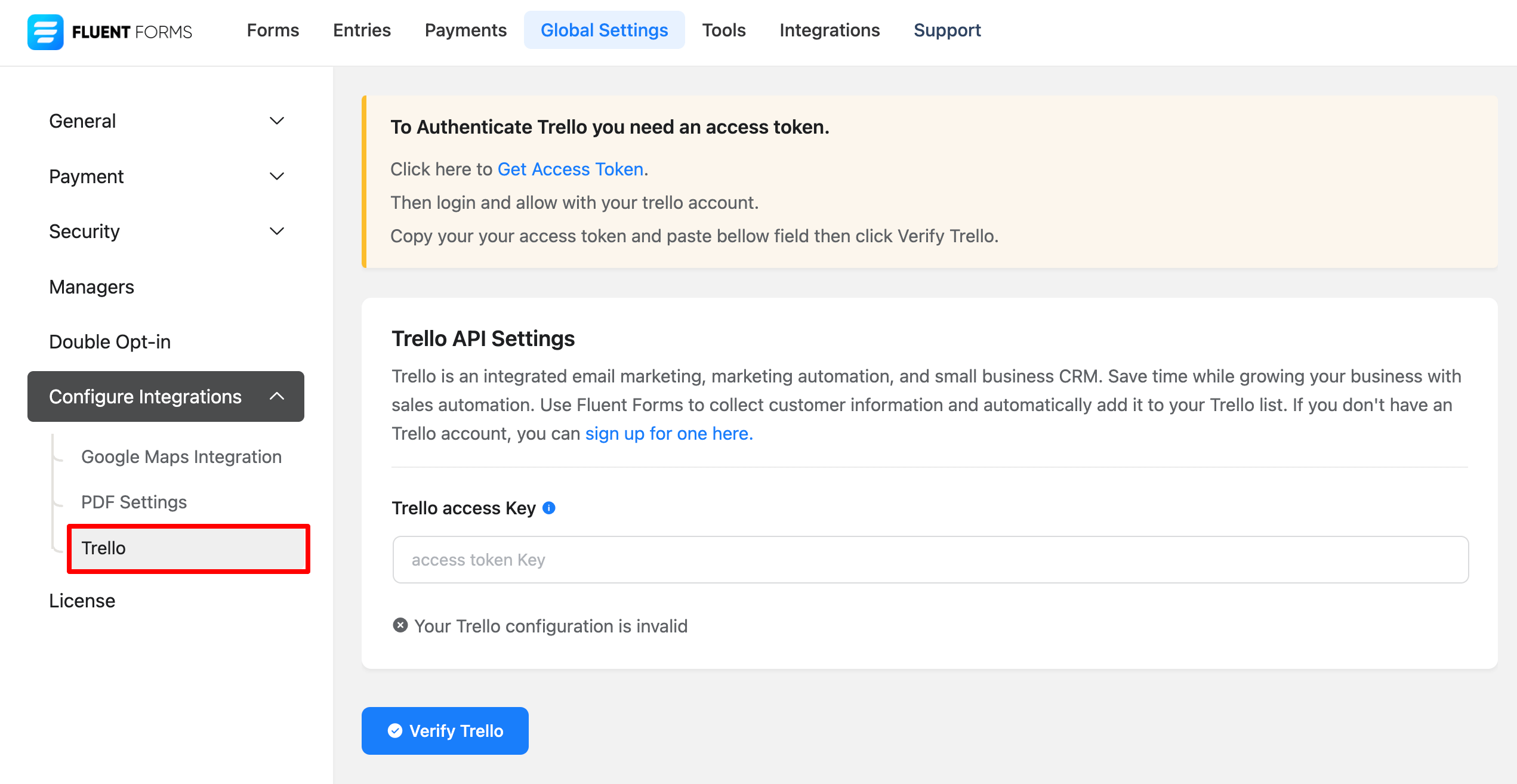 • Now, let’s go to the Global Settings of Fluent Forms to integrate your Trello account into the form.