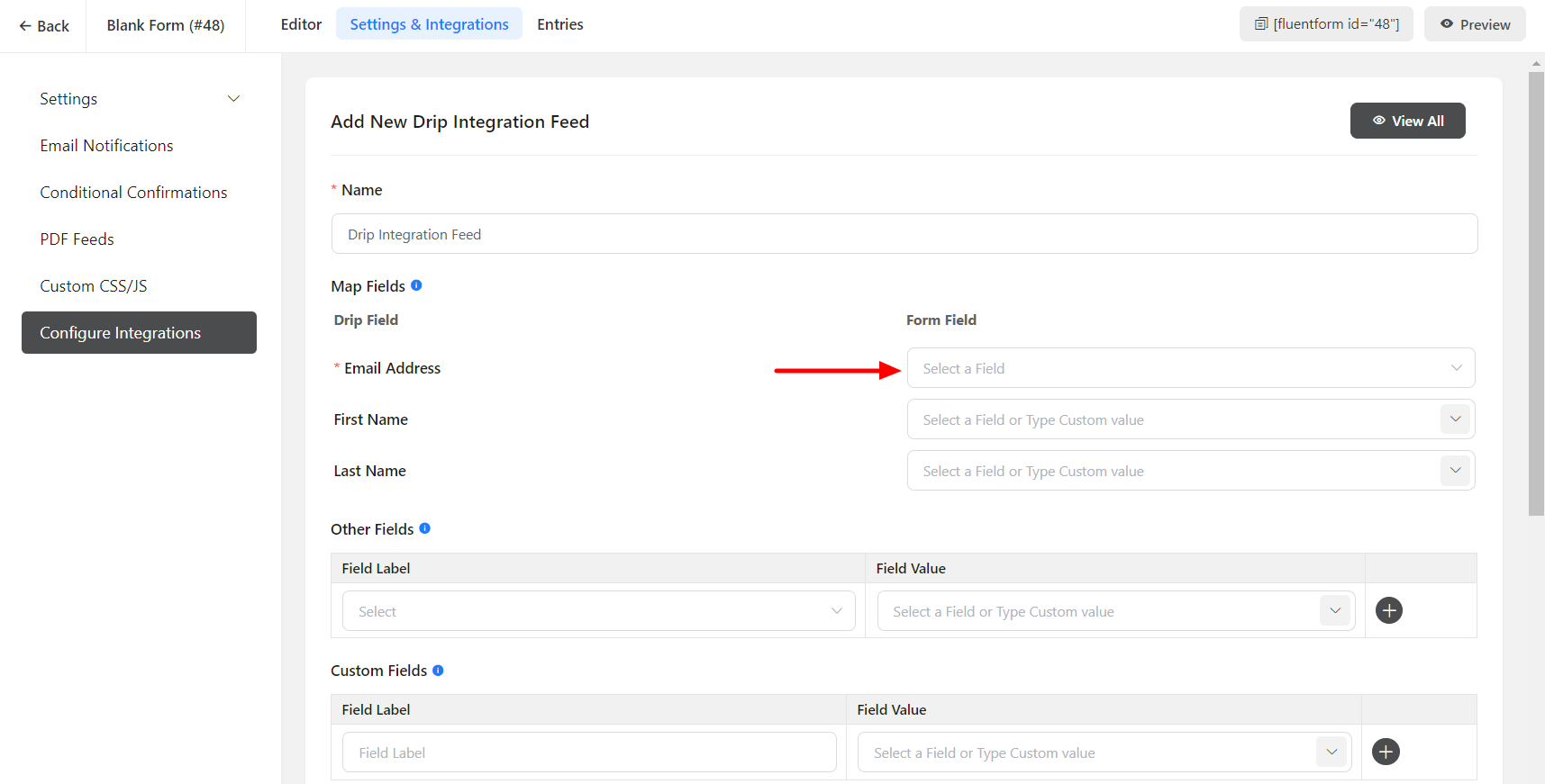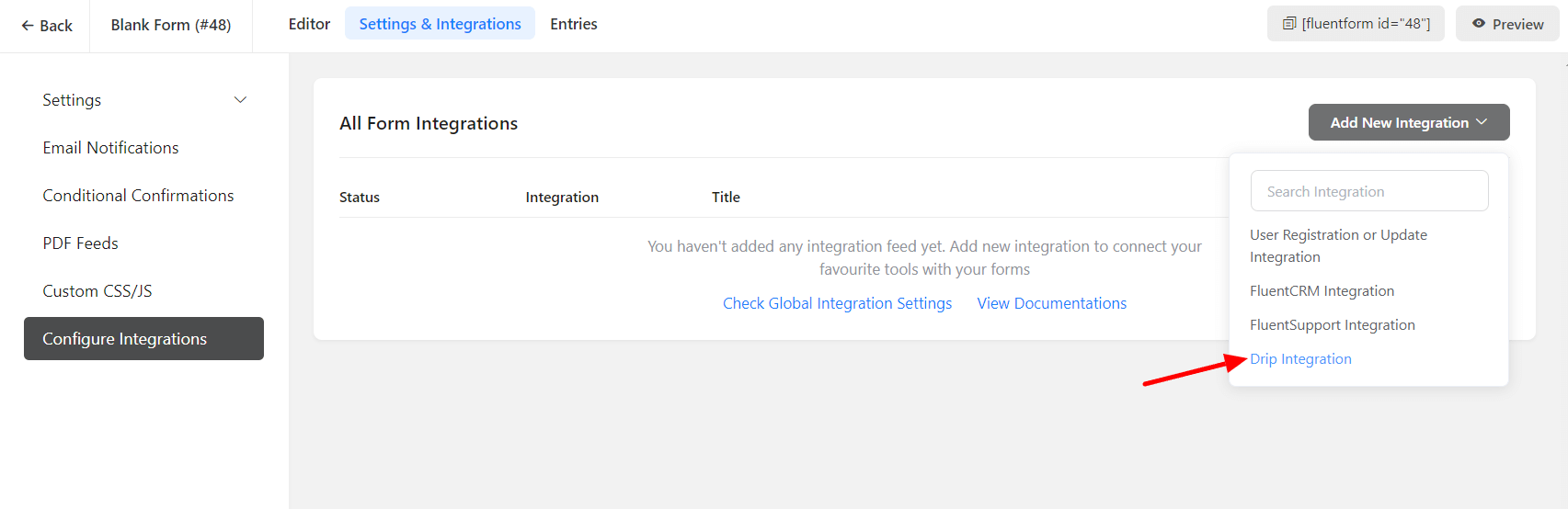 - Now, go to the particular form’s settings for the entries you want to be listed in Drip. Click on Add New Integration and select Drip Integration from the dropdown.