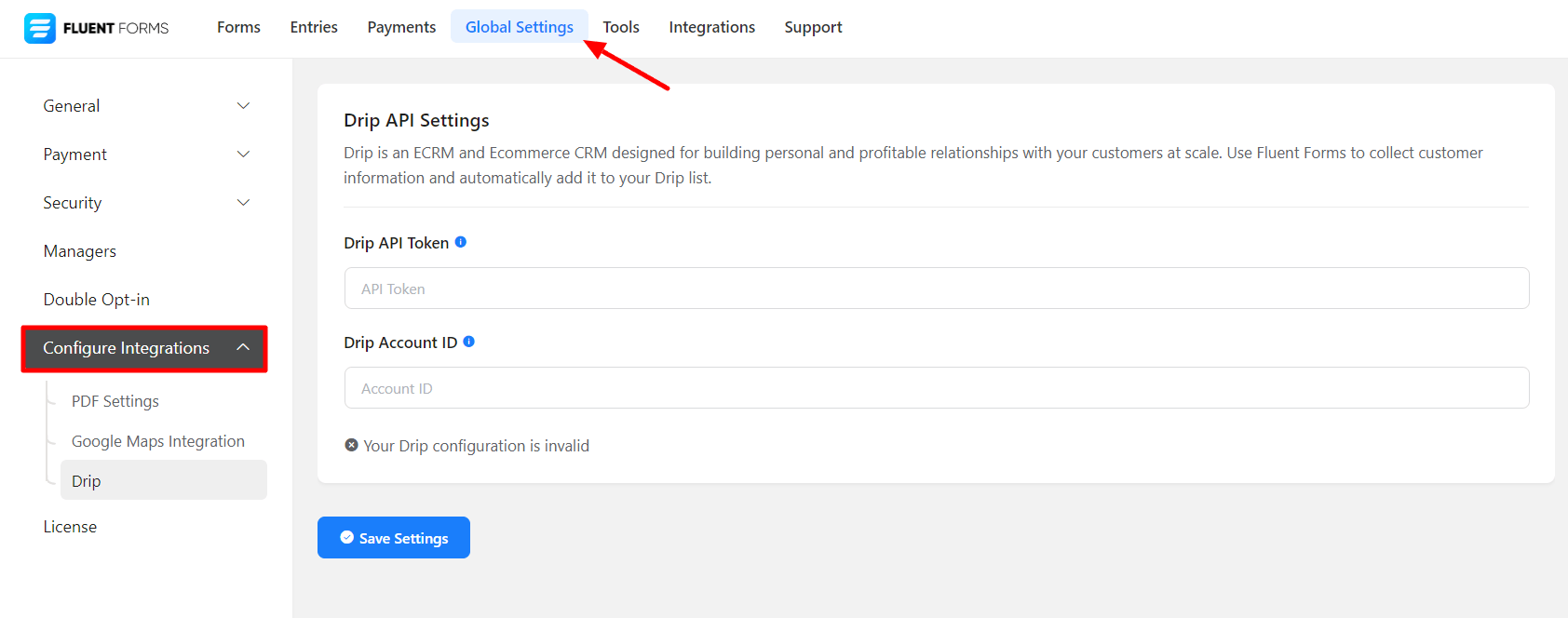 - Again hover over Fluent Forms Pro and go to Settings. Select Drip, and you will be asked for the Drip API Token & Project ID here.