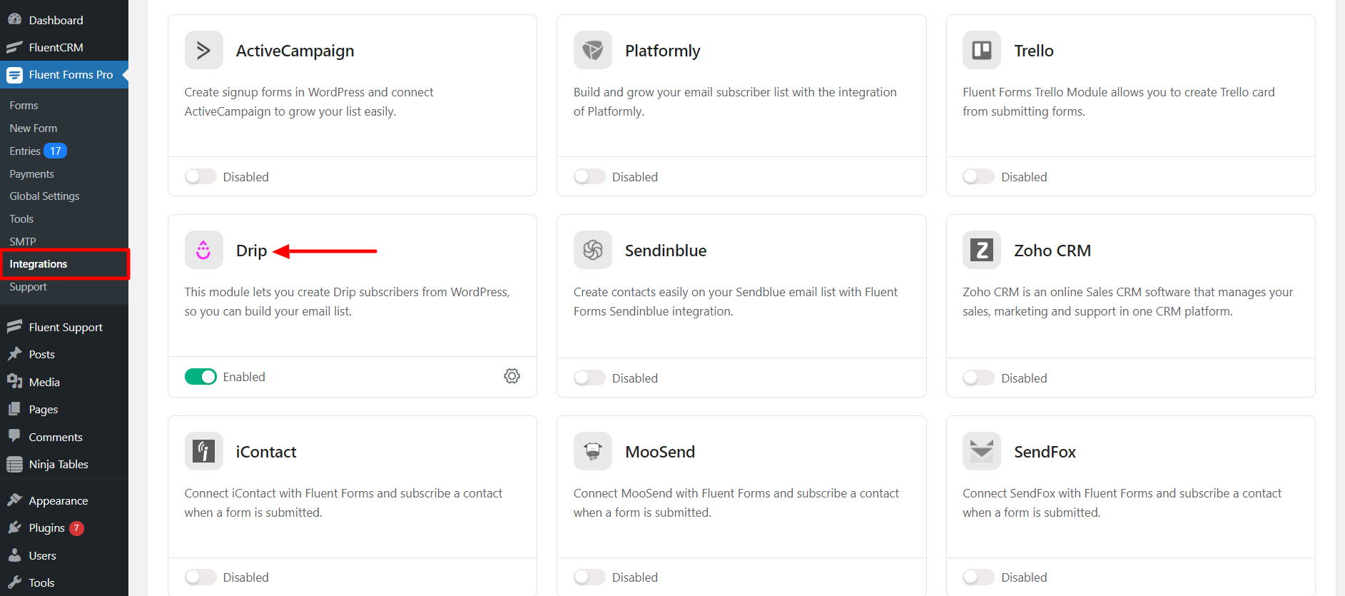 - Go to the Integration Modules from Fluent Forms (WordPress admin panel sidebar) and turn on the Drip Module, as shown in the screenshot below.