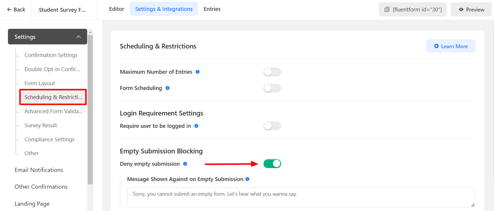 - Toggle on Deny empty submission in Empty Submission Blocking.