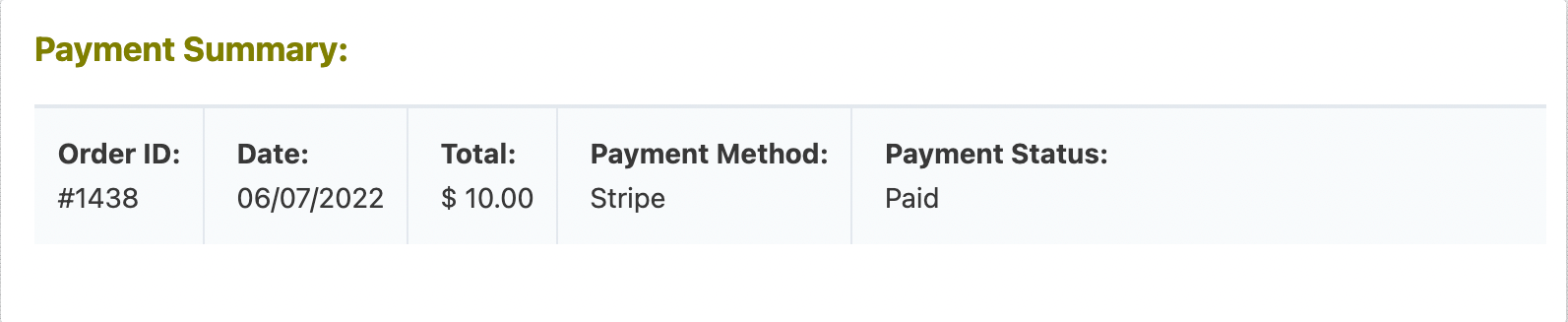 - {payment. summary} – will show the payment summary only.{payment.summary} combines {payment.payment_status}, {payment.payment_total}, and {payment.payment_method}.