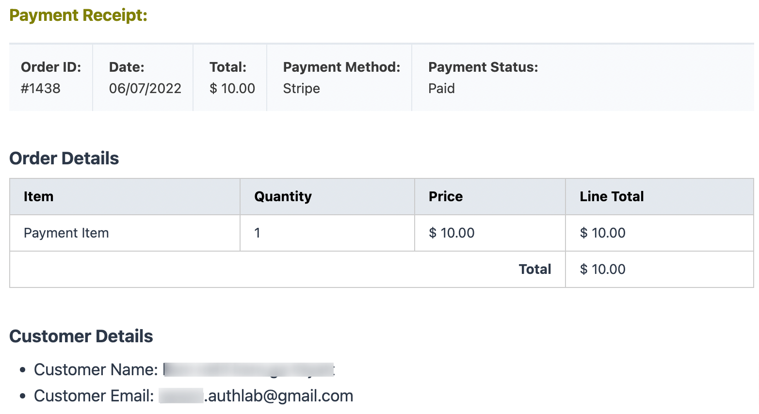 - {payment. receipt} – will show you the payment receipt including payment summary, order details, and customer details. Basically, {payment.receipt} is the combination of {payment.summary}, {payment.order_items}, and customer details.