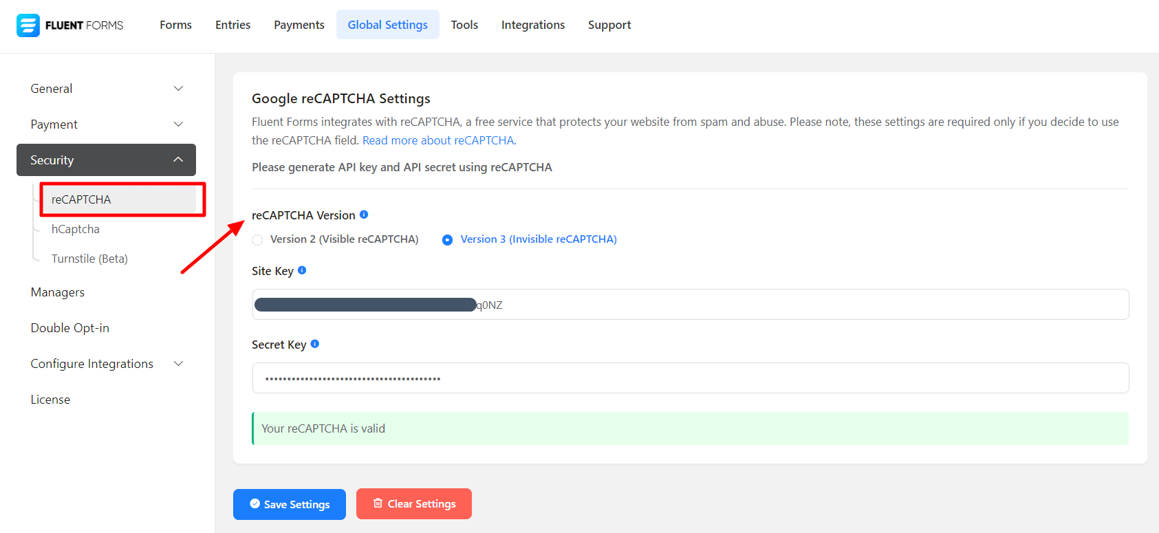 • To enable reCAPTCHA hover over Fluent Forms and click on Global Settings. Now click on the reCAPTCHA and enter your site and secret key as shown in the screenshot below.