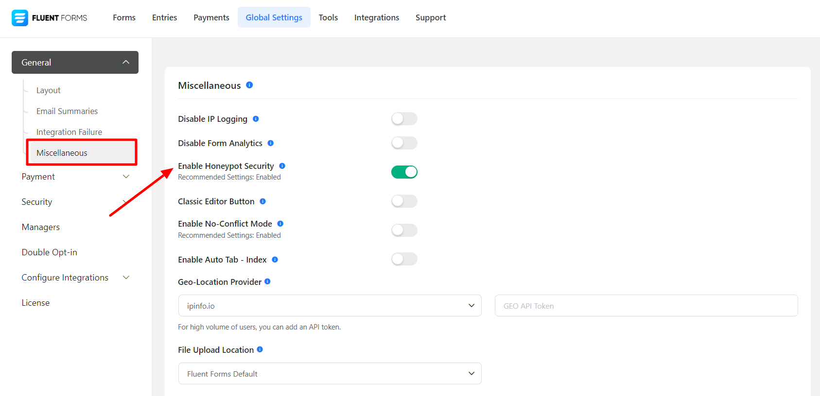 • Turn on Honeypot spam protection by going into the Fluent Forms’ Global Settings then Miscellaneous as shown in the screenshot below.