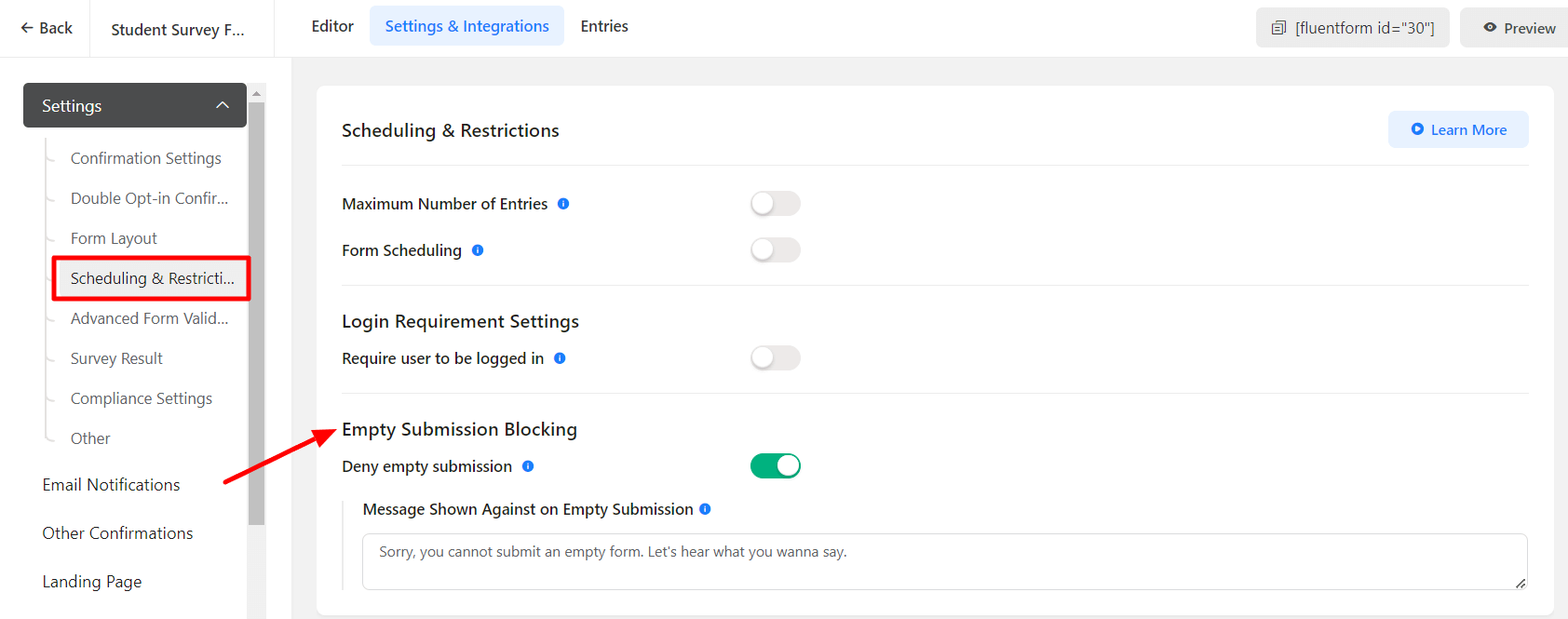 • Also, enable the Deny Empty Submission field to prevent the form from empty submissions.