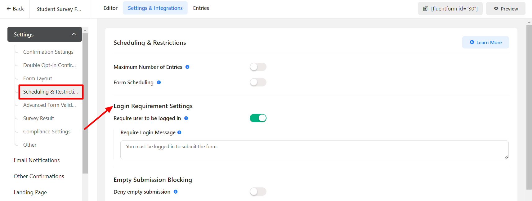 • You can also an extra layer of spam protection by enabling form submission for logged-in users only as shown in the screenshot below. Note that this setting is for each individual form not global. Also, remember that this will stop non-logged users to submit the form.