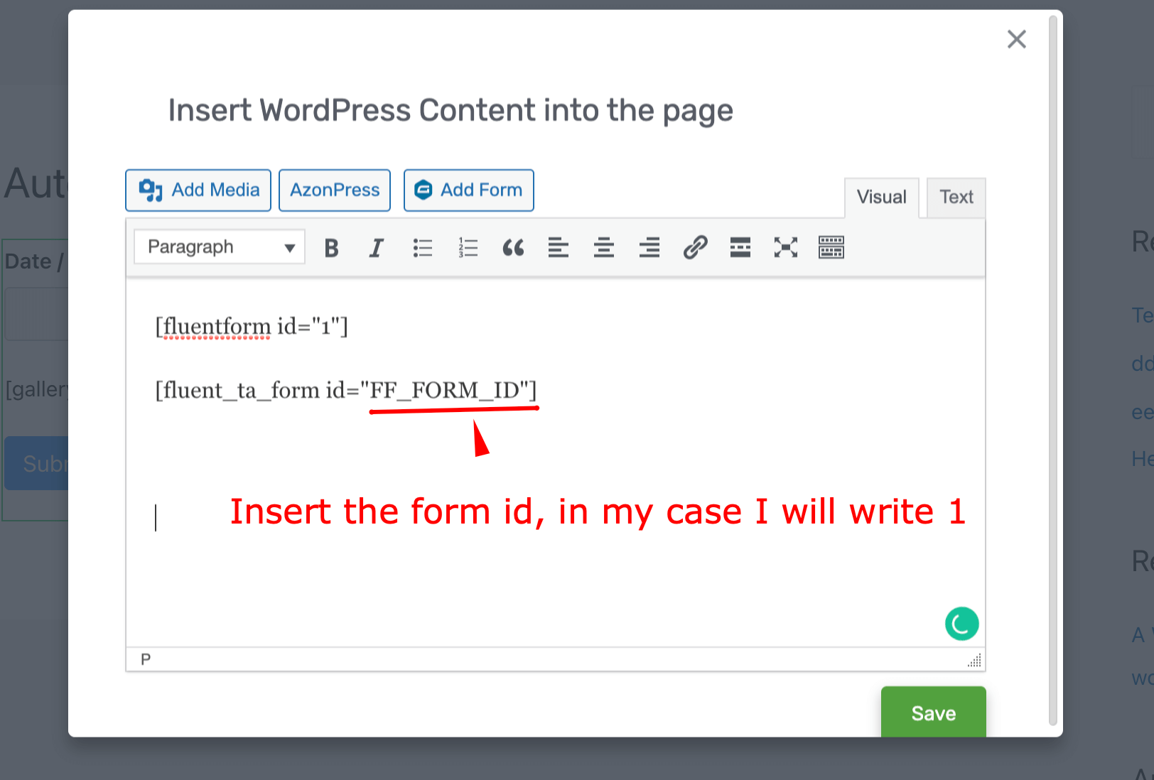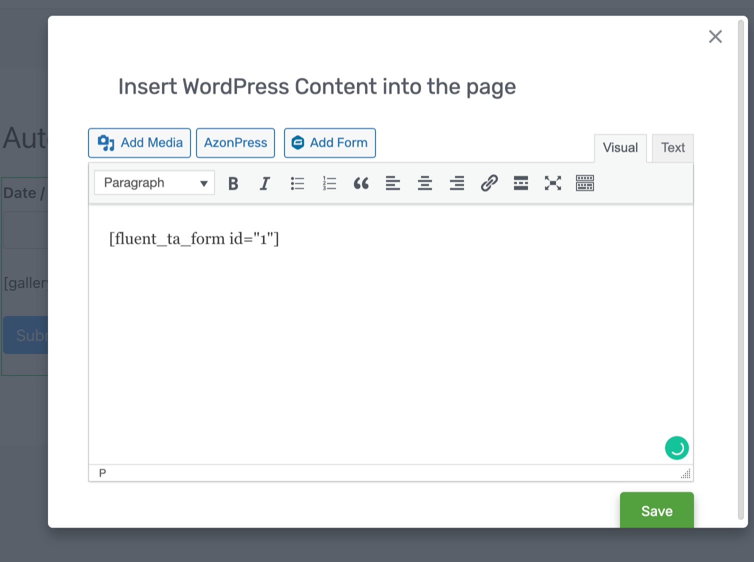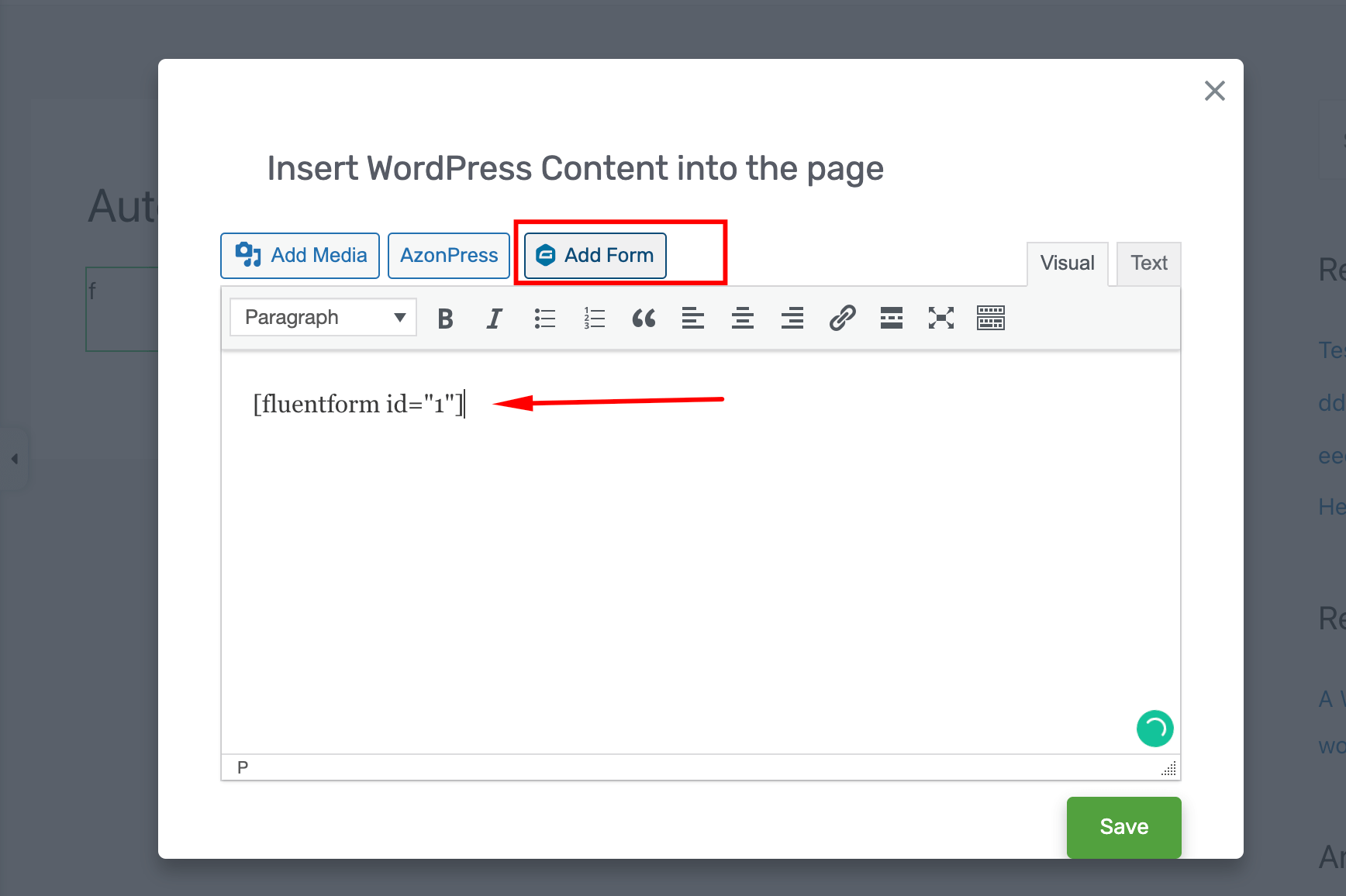 • Inside the WordPress, Content, click on the Add Form button which will pop up a window with all your forms as a dropdown element. Select the form which will add the form shortcode into the editor. You can also copy and paste your Fluent Forms shortcode into the editor manually. Click on the Save button.