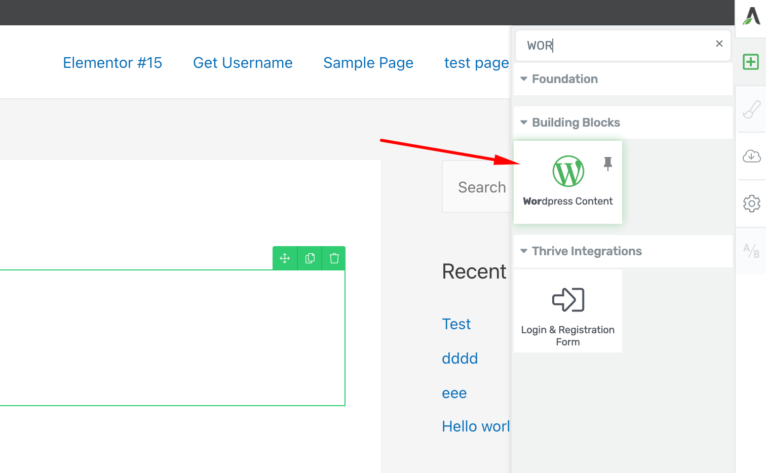 • To use Fluent Forms with Thrive Architect page builder open the page with it and add the WordPress Content module of Thrive Architect to your page as shown in the screenshot below –