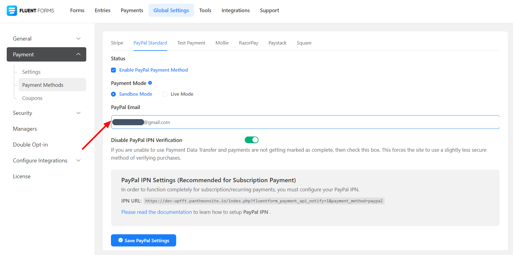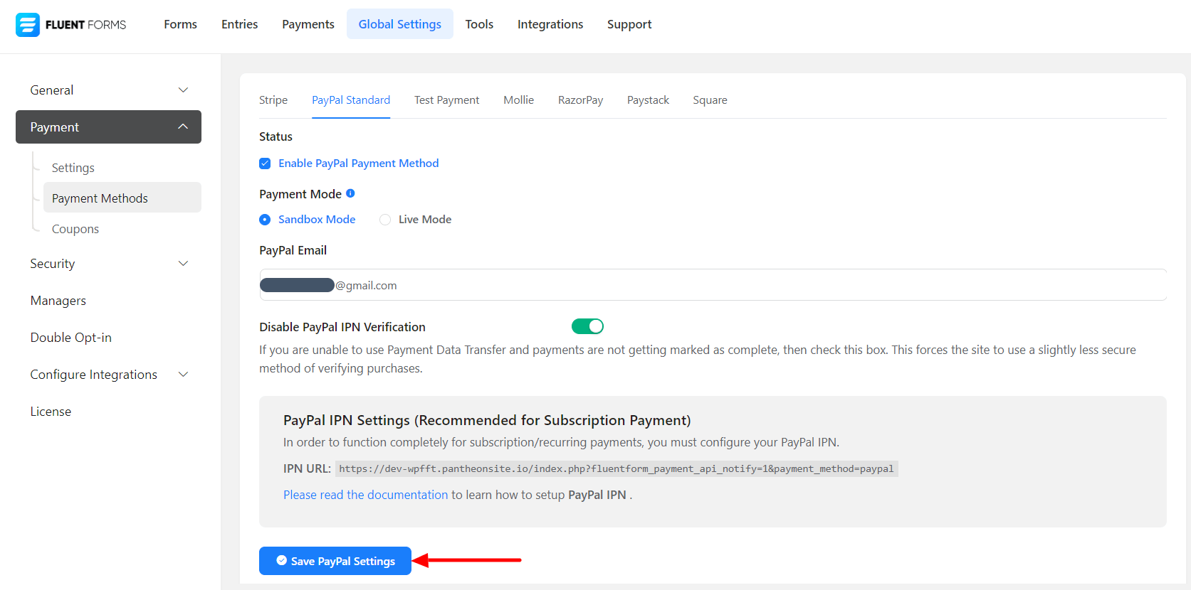 • Now click on the Save PayPal Settings. And you have successfully integrated PayPal into your Fluent Forms dashboard.