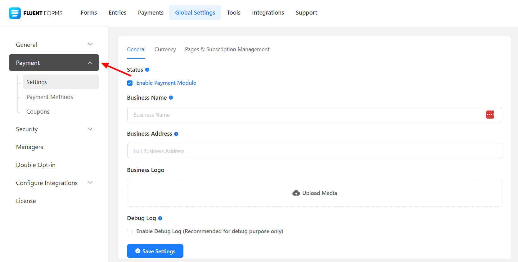 • To set up PayPal integration, go to your dashboard’s Global Settings. There’s a sidebar on the left. Choose Payment Settings.